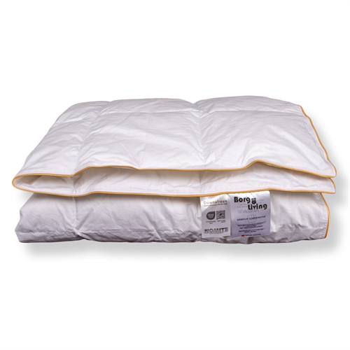 Framsidan »Inredning » Barnrummet » Täcke för baby 70x100 cm Allergivenligt baby sommartäcke 70x100 cm - Lätt sommartäcke med vita europeiska gåsdun - Borg Living baby gåsdunsdyne Spara53% Borg Living 1.899,00899,00SEKSpara 1.000,- I lager Trustpilot Antal Lägg i varukorgen Se mer från: Borg Living Artikelnummer:BL240-7 Läs vår dyngguide Läs om underhåll av täcken och kuddar Se vårt stora utbud av kuddar Har du frågor om produkten? Lätt, luftig & andningsbarRena, vita gåsdunAllergivenlig Storlek: 70x100 cm Typ: Sommartäcke - svalt Fyllning: 90% nya europeiska vita gåsdun Fyllnadsvikt: 80g Bärighet: Över 12 (Gammal mätmetod) CUIN: 800 (Ny mätmetod) Överdrag: 100% bomullscambric 80/80 Konstruktion: 3x5 kassettäcke med guldpipingkant Märke: Borg Living Tvätt: 60° (Viktigt att använda enzymfritt tvättmedel) Torktumling: Torktumlas med torkbollar Garanti: 5 år Certifiering: NOMITE - Fri från husdammmider Certifiering: Downafresh - 100% rena dun Certifiering: Downpass - Högsta djuretik Certifiering: STANDARD 100 by OEKO-TEX® (BJ025 147484 TESTEX). Din garanti för att produkten är fri från hälsofarlig kemi. Luftigt och lätt babytäcke Ett luftigt och lätt baby sommartäcke fyllt med nya, vita, europeiska gåsdun. De fina dunen och det tättvävda bomullsöverdraget i cambric-kvalitet ger ett täcke som känns silkesmjukt och faller lätt runt barnets kropp. Med en bärighet på över 12 får man ett täcke av hög kvalitet som ger den perfekta balansen mellan andningsbarhet och lätthet. Bomullscambric överdrag Det mjuka överdraget i 100% bomullscambric är vävt i små, täta kassetter som säkerställer en jämn fördelning av dunen och optimal ventilation under natten. Den täta vävningen gör också att babytäcket är NOMITE-certifierat, eftersom dammkvalster inte kan tränga igenom överdraget, vilket även gör täcket lämpligt för allergiker. Se vårt stora utbud av baby sängkläder i 70x100 cm här En lång rad certifieringar Denna serie av sommartäcken med gåsdun har en lång rad certifieringar som är din garanti för ett bra och hygieniskt kvalitetsduntäcke. Täcket är både NOMITE- och Downafresh-certifierat, vilket garanterar att dunen är rengjorda och bearbetade enligt strikta europeiska standarder och att de kommer från producenter som följer reglerna för djurvälfärd. För enkel förvaring levereras täcket i en praktisk förvaringspåse så att du kan skydda och bevara täckets egenskaper när det inte används. Kom bara ihåg att se till att täcket är helt torrt innan du packar undan det - eventuellt efter en tur i torktumlaren. Det danska märket Borg Living producerar exklusiva serier av täcken, kuddar och hemtextilier för ditt hem. Märket som grundades 2013 är bland annat känt för sin nytänkande kvalitet och design. Borg Livings fantastiska produkter bidrar till en optimal och behaglig nattsömn samt pryder ditt hem med moderna och fina hemtillbehör. Tillbaka till Täcke för baby 70x100 cm