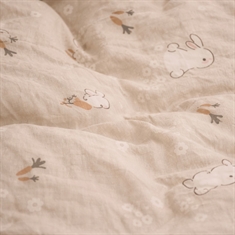 Härligt sängset med print av kaniner. Baby sängkläder passar till en vanlig babytäcke storlek och kan användas i sängen, i babynestet, i barnvagnen eller var täcket än tas med. Babytäcket är ofta fast runt barnet många timmar om dygnet eftersom det skapar stor ro, igenkänning, trygghet och värme för babyn - inte bara den första tiden, utan ofta upp till 2-3 års ålder. Det används därför mycket och tvättas ofta, och därför önskar de flesta också mjuka sängkläder i bomull av hög kvalitet.
