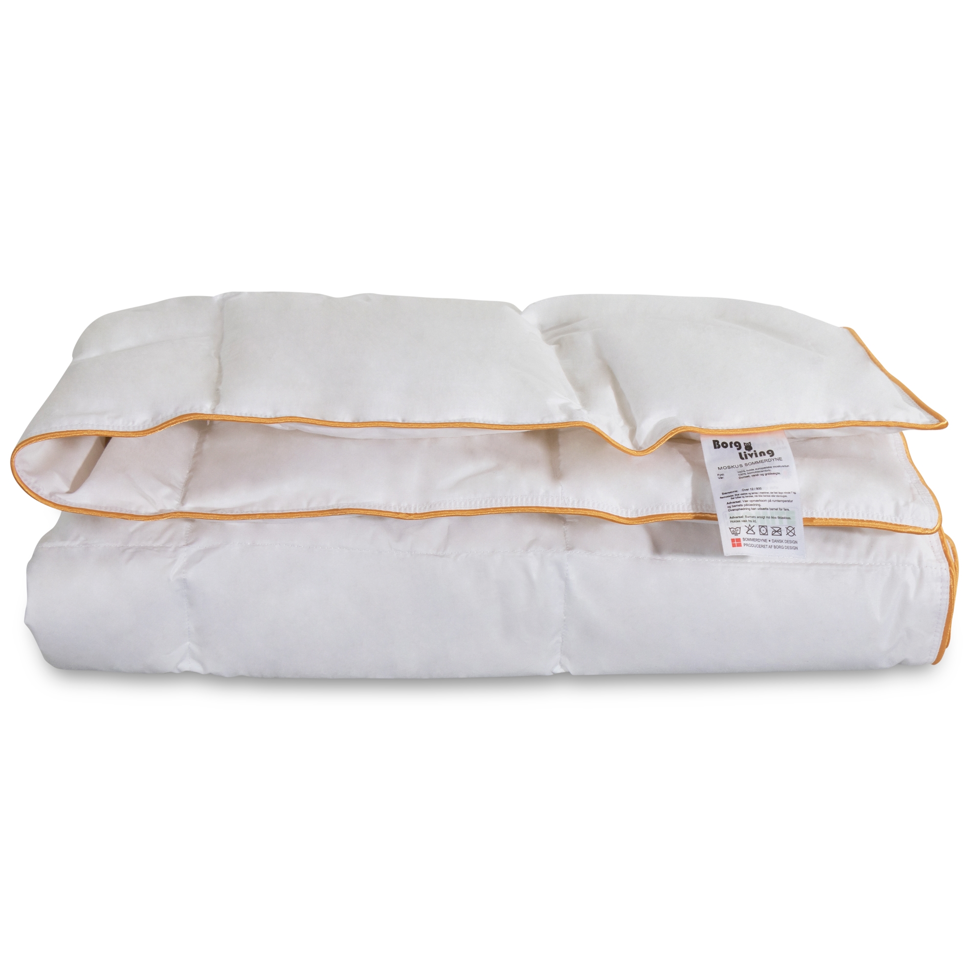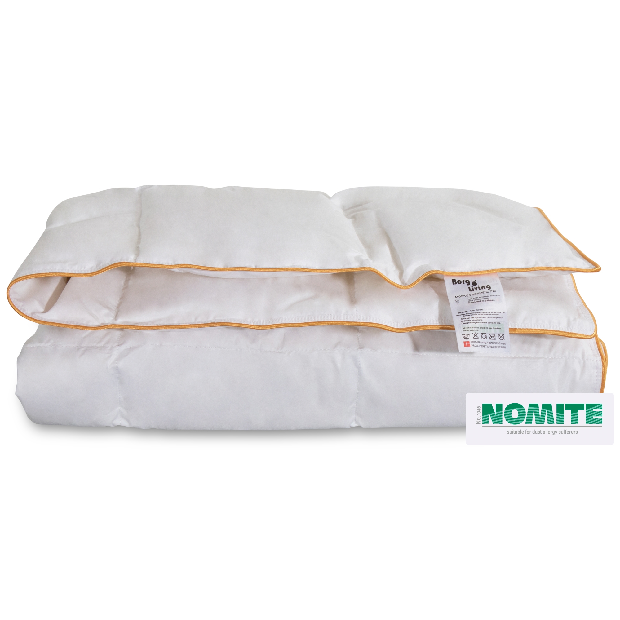 Framsidan »Täcken » Värmeklass » Sommartäcken Babytäcke för sommaren 70x100 cm - 100 % myskdun täcke för baby - Borg Living Spara54% Borg Living 1.299,00599,00SEKSpara 700,- I lager Trustpilot Antal Lägg i varukorgen Se mer från: Borg Living Artikelnummer:BL236 Läs vår täckesguide Läs om underhåll av täcken och kuddar Se vårt stora utbud av barnkuddar Har du frågor om produkten? 100 % myskdun - Borg LivingBärighet: Över 12Sommartäcke Storlek: 70x100 cm täcke för baby Typ: sommartäcke - svalt täcke Fyllning: 100 % nya vita europeiska myskdun Varumärke: Borg Living Bärighet: Över 12 (gammal mätningsmetod) Bärighet: 800 (ny mätningsmetod) Fyllnadsvikt: 80 g Yttertyg: 100 % bomull super cambric 60/60 Konstruktion: 3x5 kassettäcke med guldkant Tvätt: 60° (Viktigt att använda enzymfritt tvättmedel) Torktumling: Ska torktumlas med torkbollar Garanti: 5 år Certifiering: NOMITE - Allergivänlig och fri från husdammskvalster Certifiering: DOWNAFRESH - 100 % rena dun Certifiering: STANDARD 100 by OEKO-TEX® (BEHO 062282) / BJ025 147484 TESTEX Se alla våra barnkuddar här Täcke för baby - ett härligt svalt och luftigt sommartäcke med europeiskt myskdun. Täcket är perfekt för den lilla babyn under de varma sommarnätterna, när det kan vara svårt för babyn att själv reglera värmen. Täcke för baby är fyllt med mjukt, fint ejderdunliknande myskdun som gör täcket lätt och andningsbart. Det mjuka och lätta dunet gör att täcket faller mjukt runt barnets kropp. Täcket är sytt i kassetter så att dunet fördelas jämnt i täcket. Sommartäcket har ett härligt mjukt yttertyg i 100 % bomullscambric som är så tätvävt att dammkvalster inte kan tränga igenom. Sommartäcket har en rad certifieringar som är din garanti för ett bra och hygieniskt kvalitetstäcke. Täcket är NOMITE-certifierat, vilket innebär att täcket är mycket lämpligt för allergiker eftersom det är fritt från husdammskvalster. Täcket är även DOWNAFRESH-certifierat – en certifiering som garanterar att de dun som använts under produktionen är tvättade och rengjorda enligt de stränga kraven i europeiska standarder. DOWNAFRESH-certifieringen garanterar också att det insamlade dunet uppfyller lagkrav om god djurvälfärd. Det danska varumärket Borg Living producerar exklusiva serier av täcken, kuddar och hemtextilier för ditt hem. Varumärket, etablerat 2013, är känt för sin innovation inom kvalitet och design. Borg Livings fantastiska produkter bidrar till en optimal och bekväm nattsömn, samtidigt som de dekorerar ditt hem med moderna och stiliga hemaccessoarer. Tillbaka till Sommartäcken