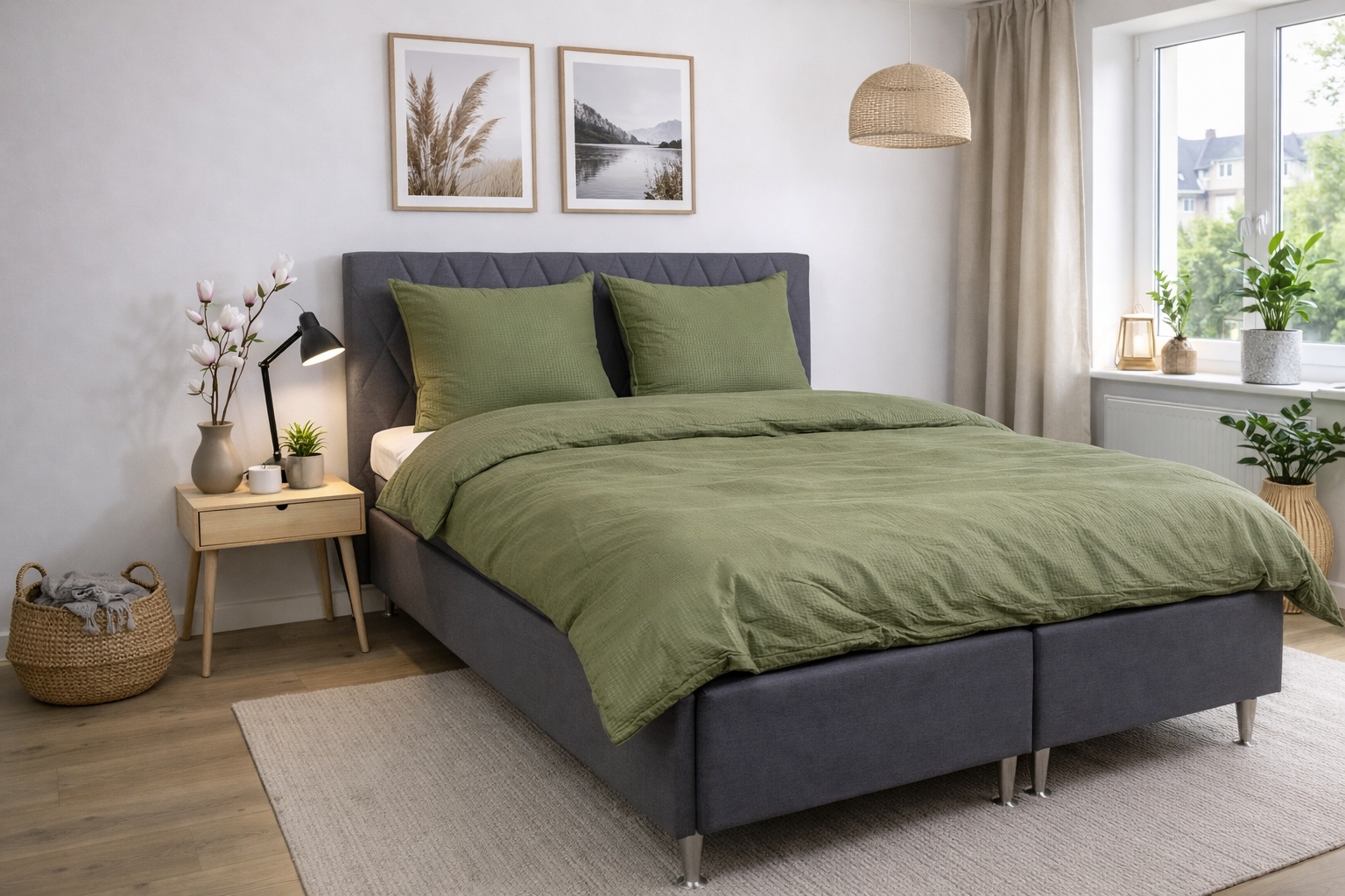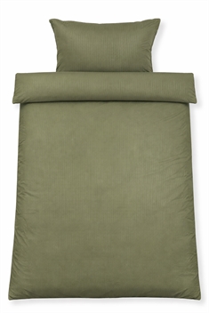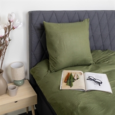 Det enfärgade gröna sänglinet tillför sovrummet ro och harmoni och är enkelt att kombinera med både neutrala och färgstarka påslakan och kuddar.