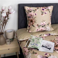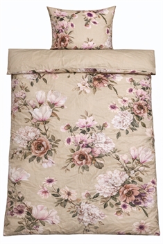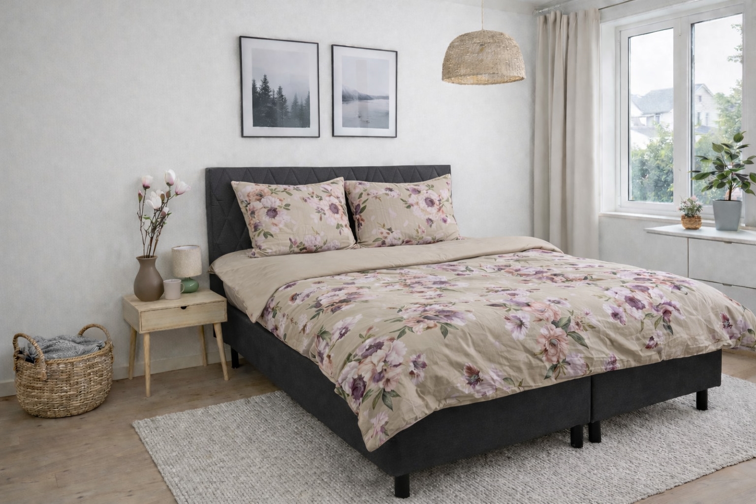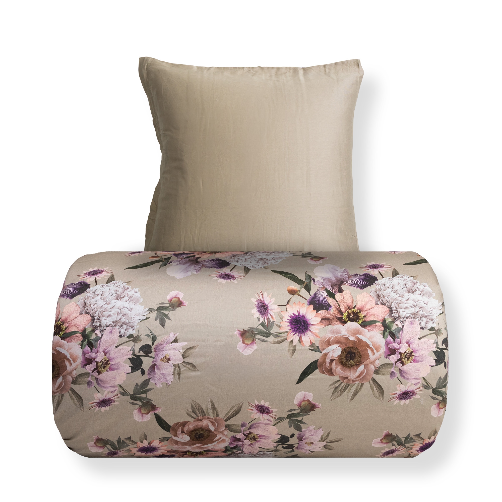 Skapa ett elegant och personligt uttryck i sovrummet med detta vändbara bäddset i 100% bomullssatin. Bäddsetet kombinerar ett vackert blommönster i sand- och beige nyanser på ena sidan med en lugn, enfärgad baksida, så att du enkelt kan byta uttryck beroende på stämning och inredning.