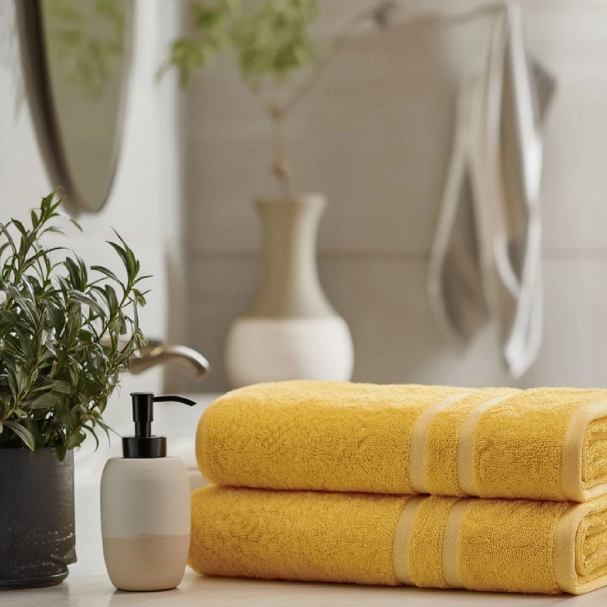 Upplev en härlig kombination av mjuk komfort, god absorptionsförmåga och stilren design med denna gula handduk från IN Style. Handduken mäter 50x90 cm och är tillverkad i 100% mjuk bomull, vilket ger en behaglig och lätt fyllig känsla mot huden. Den praktiska storleken gör handduken idealisk för dagligt bruk vid handfatet, där den snabbt och effektivt torkar händerna efter användning, eller som en mindre handduk efter duschen.