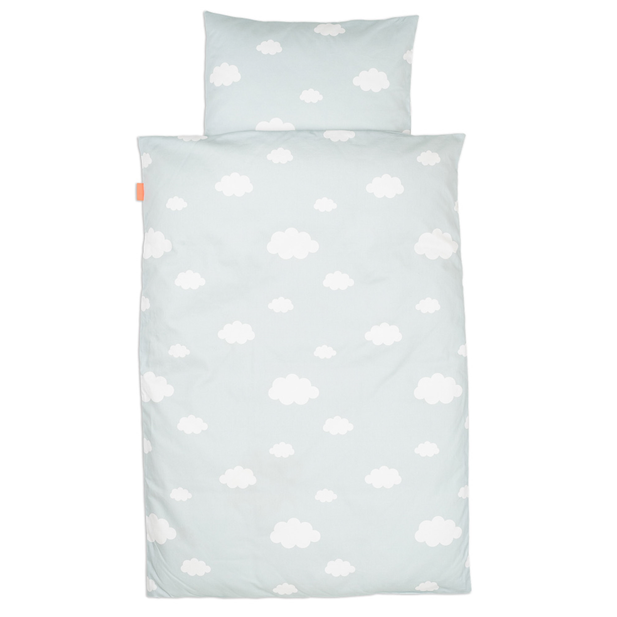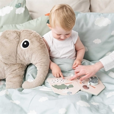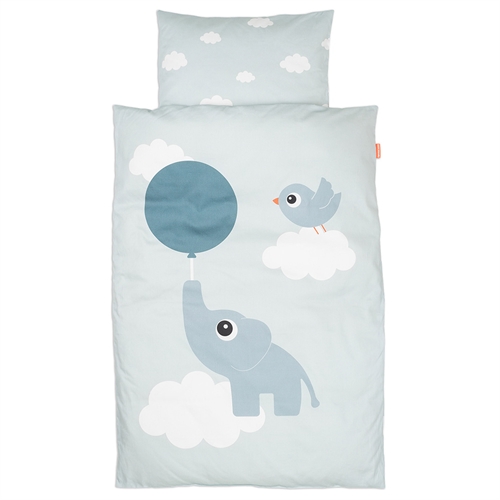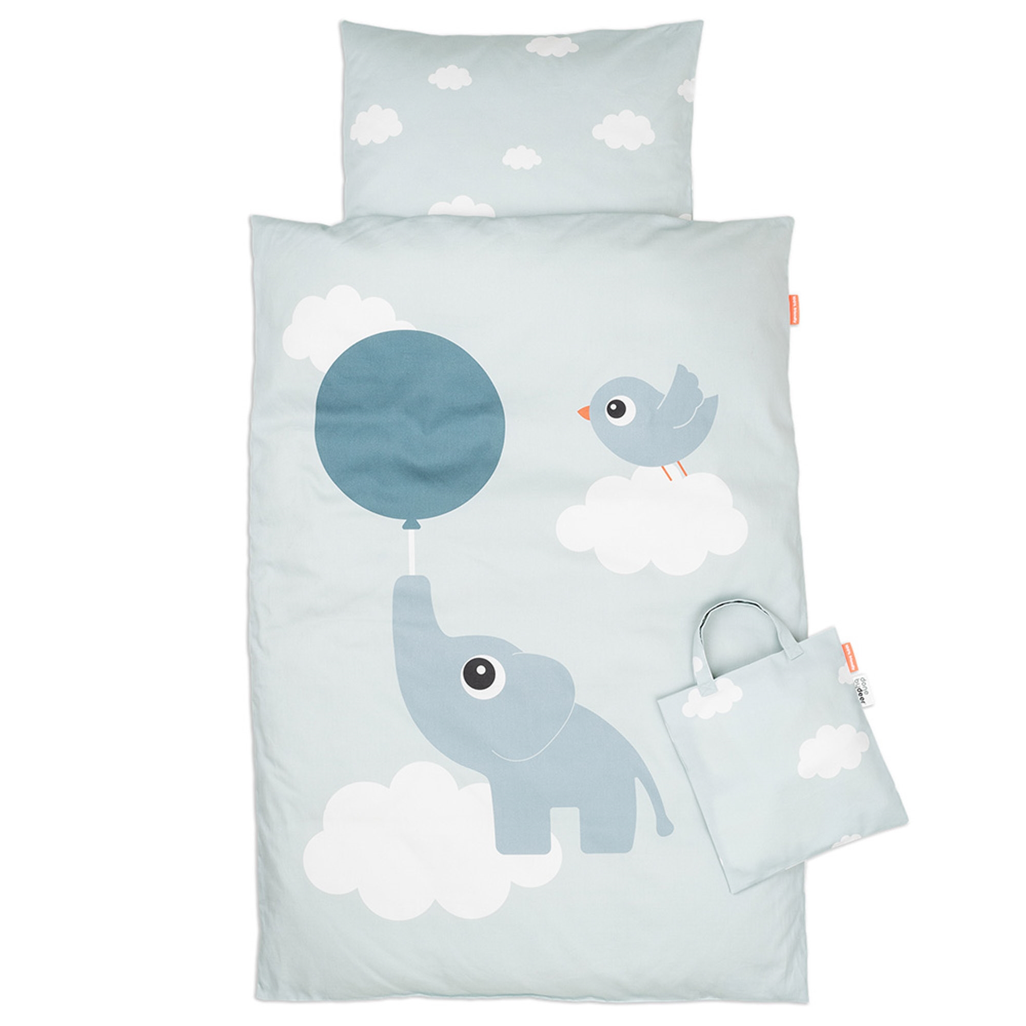Det söta motivet med elefanten Elphee, Birdee, ballonger och moln skapar en trygg och lekfull stämning kring barnet. Setet är vändbart, så du enkelt kan växla uttryck mellan det fina motivet och det lugna molntrycket på baksidan.