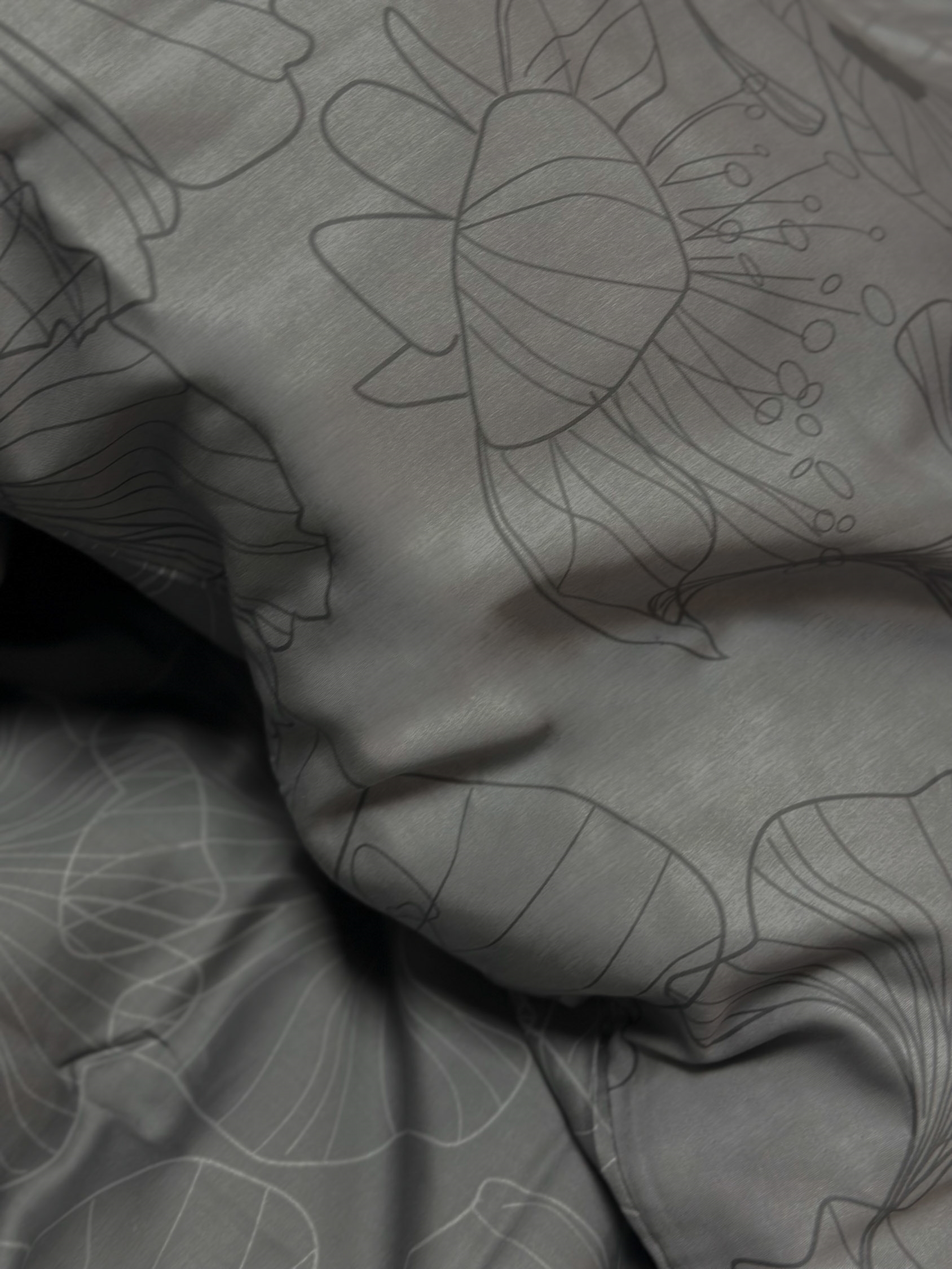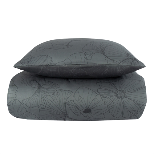 Det vändbara designet ger dig två olika looks i ett påslakanset. Framsidan har ett elegant blomsterprint i ljusgrå nyans, medan baksidan är mörkgrå. Det gör påslakanet lätt att kombinera med olika färger, kuddar och plädar och ger större flexibilitet i inredningen.