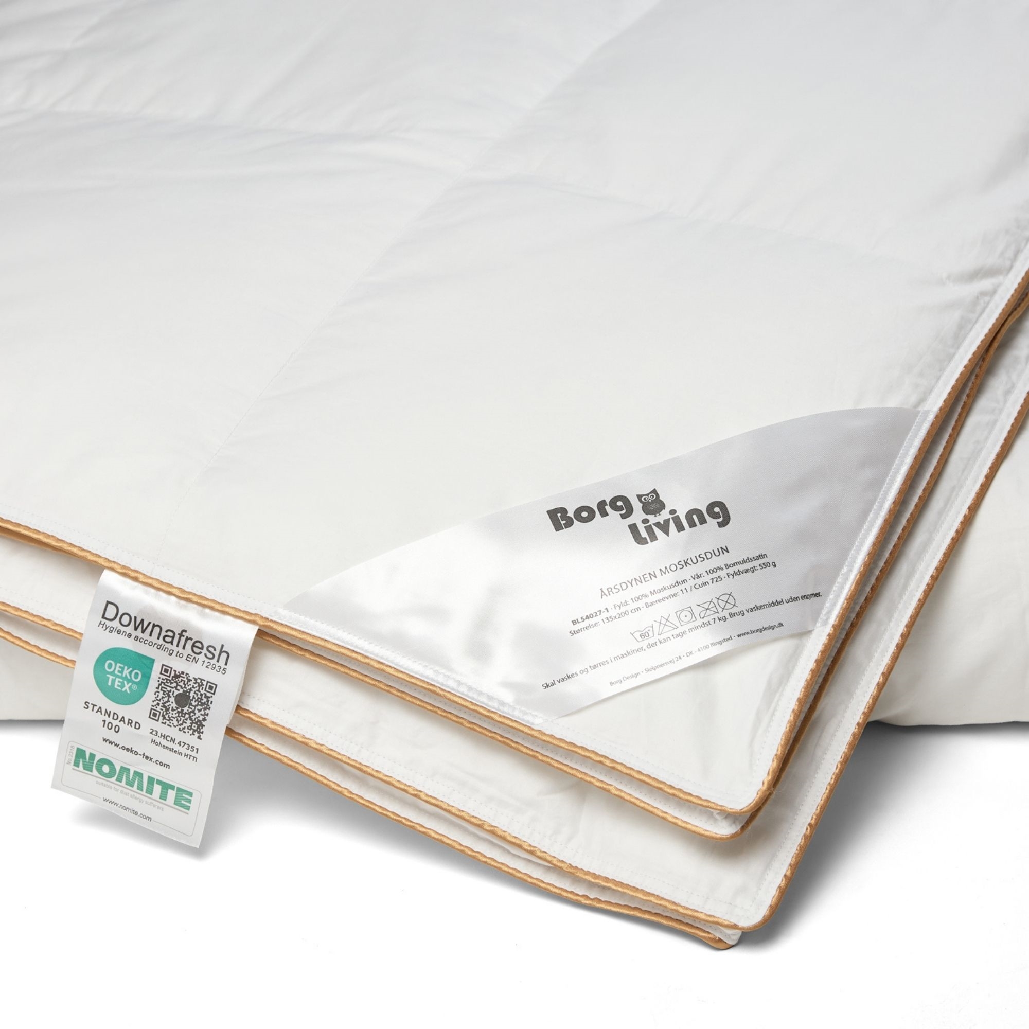 Med komfort och kvalitet helt i topp, kan detta myskduntäcke vara precis det du letar efter. Dubbel täcket är producerat av mjuka kvalitets myskdun, som har en hög och god isolering. Duntäcket är konstruerat med kassetter och en 3 cm boxkant (även kallad panelkant), som ger dunen helt ideala förhållanden för att isolera och hålla täcket varmt, lätt och luftigt. Boxkanten utgör även en barriär mot köldbryggor, och kan därför isolera jämnt och behagligt genom hela täcket - ända ut till kanterna, samt utnyttja dunens kvalitet och värme fullt ut. De mjuka dunen är beklädda med ett exklusivt bolster av fint vävt bomullssatin, vilket gör täcket allergivänligt och duntätt. Bolstret ger också täcket den härliga finish och uttryck, som innehållet, konstruktionen och hela täcket förtjänar.
