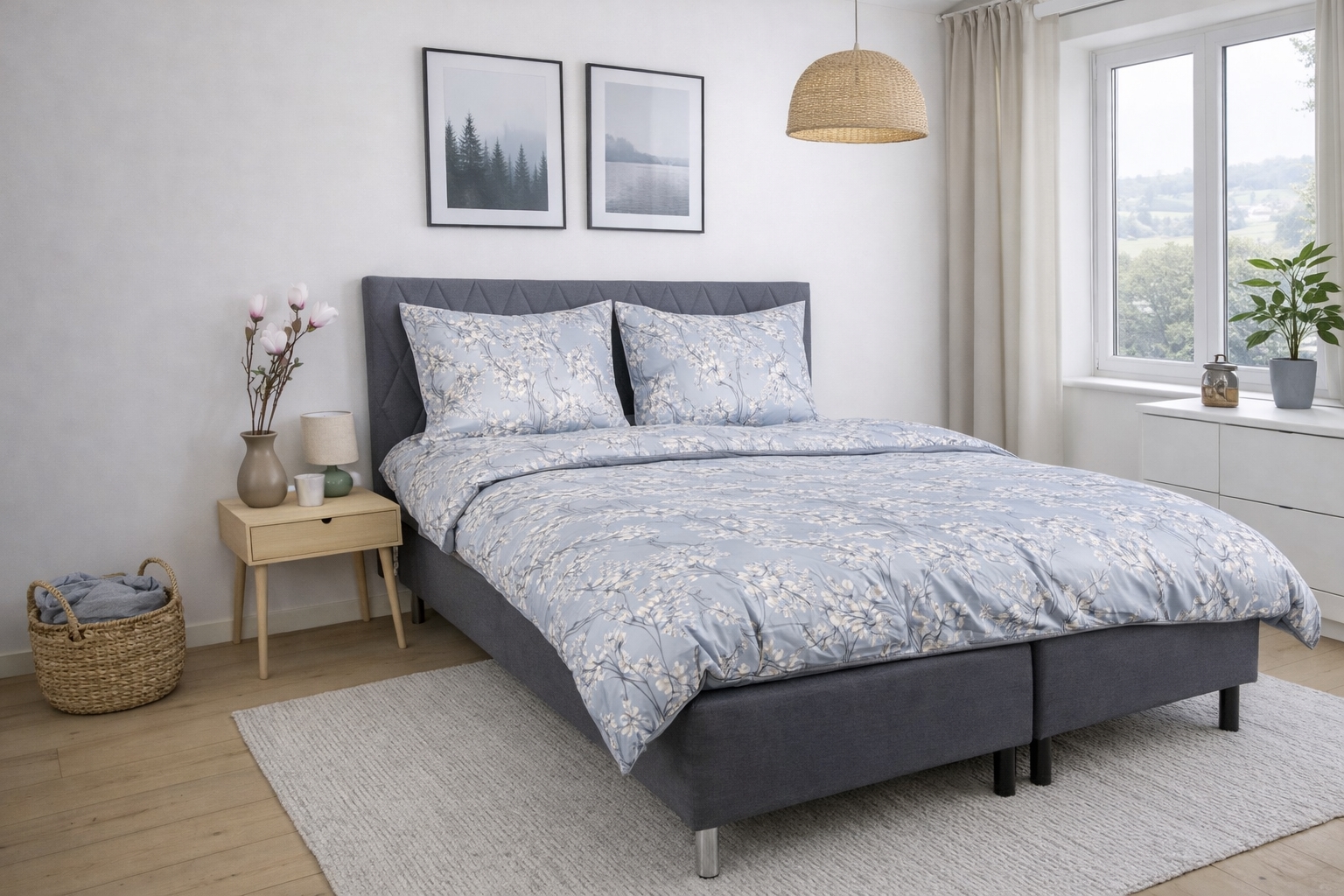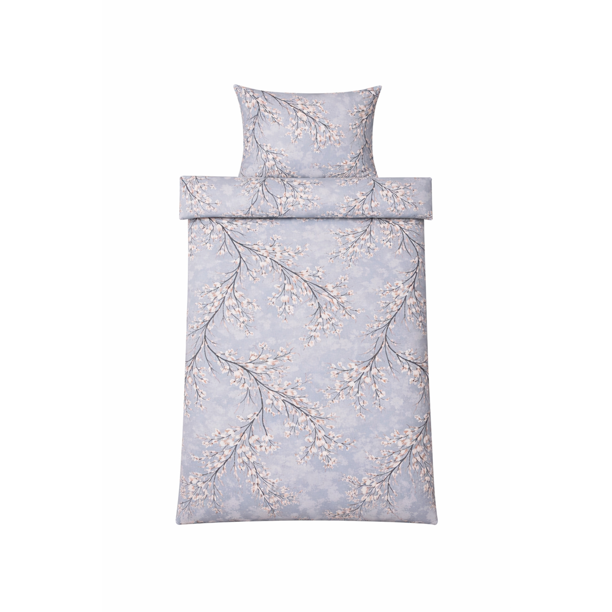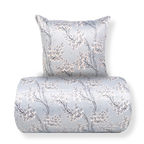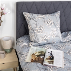 Det vändbara designet ger två looks i ett påslakansset. Framsidan har ett elegant blomtryck i varma ljusblå nyanser medan baksidan är enfärgad och mer dämpad. En flexibel lösning som gör det enkelt att variera stilen i sovrummet.
