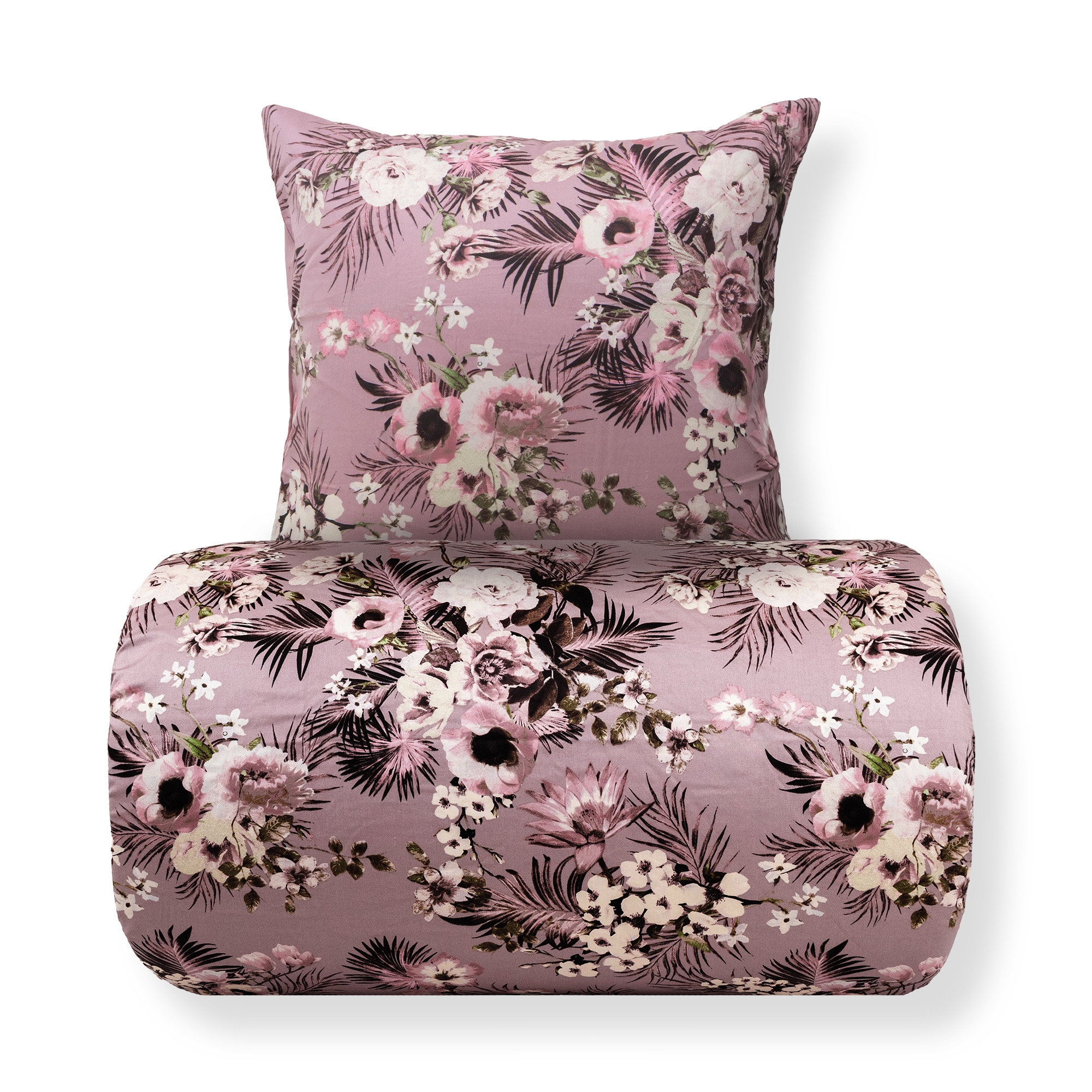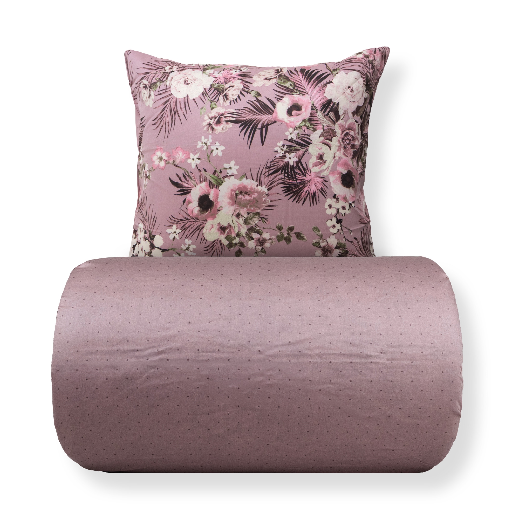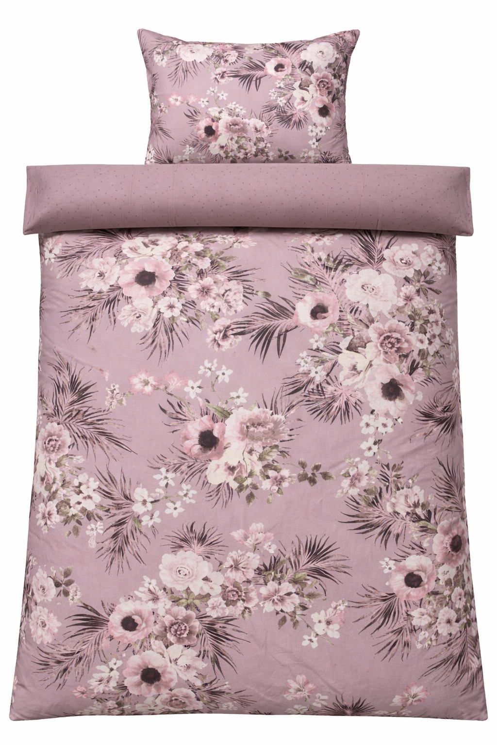 Skapa en stämningsfull och elegant atmosfär i sovrummet med detta vackra dubbla bäddset i 100% bomullssatin. Bäddsetet kombinerar ett dekorativt blomstertryck med ett lugnare prickigt mönster på baksidan, så du enkelt kan byta uttryck i sovrummet genom att bara vända påslakanet.