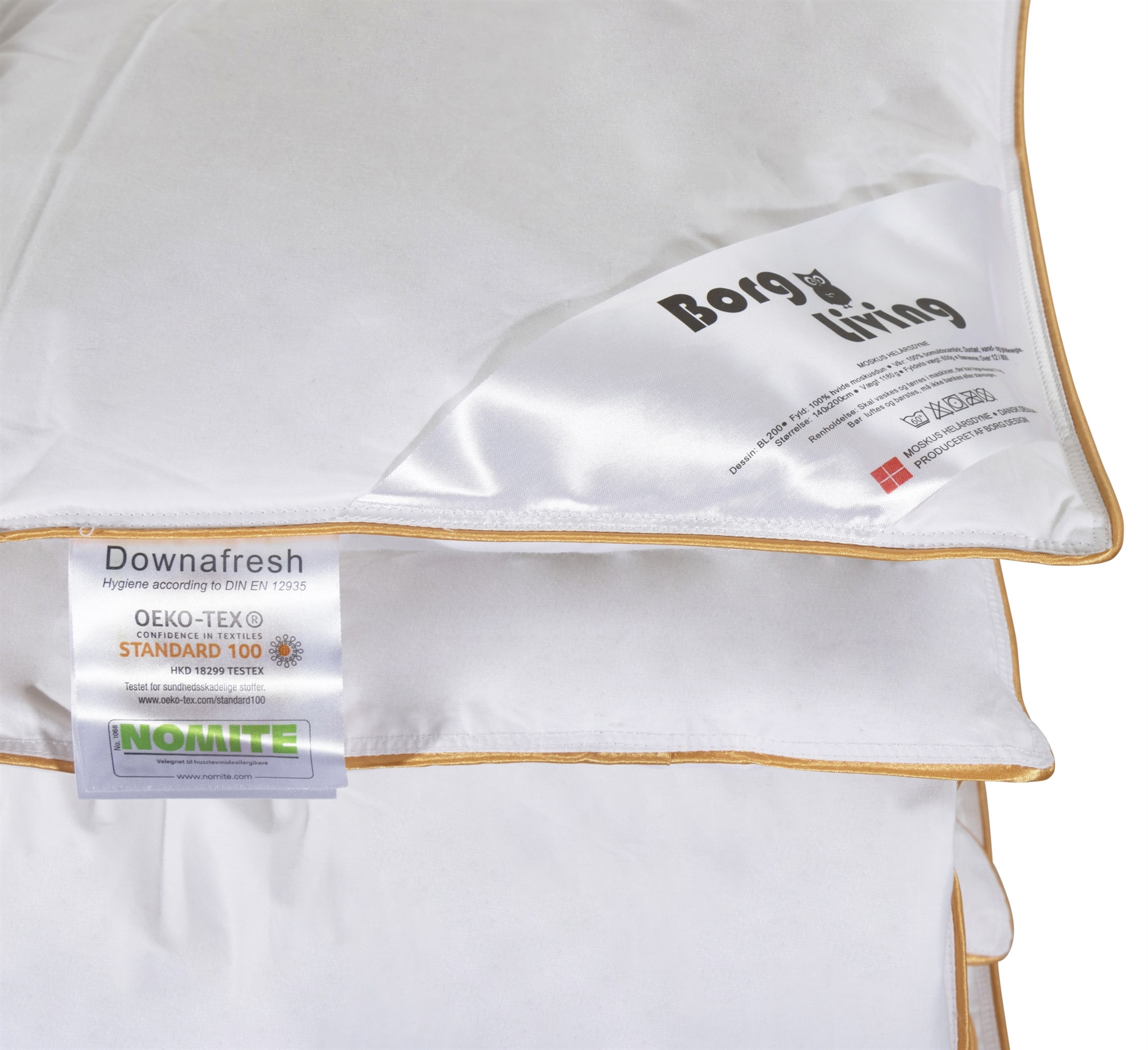 Framsidan »Täcken » Enkeltäcken » Enkeltäcke 140x200 cm Helårstäcke 140x200 cm - Myskduntäcke - Borg Living täcke med myskdun Spara66% Borg Living 4.699,001.585,00SEKSpara 3.114,- Fri frakt på denna varaI lager Trustpilot Antal Lägg i varukorgen Se mer från: Borg Living Artikelnummer:BL-200 Läs vår täckesguide Läs om underhåll av täcken och kuddar Se vårt stora utbud av kuddar Har du frågor om produkten? Myskduntäcke - Borg LivingBärighet: Över 12100 % myskdun Storlek: 140x200 cm Typ: Helårstäcke - Ludd Fyllning: 100 % europeiskt vitt myskdun Varumärke: Borg Living Fyllnadsvikt: 600 g Bärighet: Över 12 (gammal mätmetod) Bärighet: 800 (ny mätmetod) Yttertyg: 100 % duntät bomullskambric Konstruktion: 4x6 kassettäcke med guldkant Tvätt: 60° (Viktigt att använda enzymfritt tvättmedel) Torktumling: Torktumlas med torkbollar Garanti: 5 år Levereras i väska Certifiering: NOMITE - Fri från husdammskvalster Certifiering: DOWNAFRESH - 100 % ren dun Certifiering: STANDARD 100 by OEKO-TEX®. (1176-194) Se alla våra kuddar här Myskdun påminner om det exklusiva ejderdunet eftersom de ger mjuka, lätta och luftiga täcken. Dessutom gör myskdun att täcket värmer bra. Fukt absorberas också av täcket så att du inte blir helt fuktig om du känner dig lite varm på natten. Sammantaget gör detta att täcket är bekvämt att sova med. Se vårt stora utbud av sängkläder i 140x200 cm här Täcket har ett mjukt yttertyg med 100% duntät bomullscambric och är så tättvävt att dammkvalster inte kan tränga igenom. Täcket är sytt i kassetter med guldpiping och har kanalväggar så att dunet isolerar utan köldbryggor. Det danska varumärket Borg Living producerar exklusiva serier av täcken, kuddar och hemtextilier till ditt hem. Varumärket grundades 2013 och är bl.a. känt för sin innovation inom kvalitet och design. Borg Livings fantastiska produkter bidrar till en optimal och bekväm nattsömn samt dekorerar ditt hem med moderna och snygga hemtillbehör. Tillbaka till Enkeltäcke 140x200 cm Du kanske också är intresserad av: Varmt täcke 140x200 cm - myskduntäcke från Borg Living med 100% dunMyskduntäcke - Borg Living Bärighet: Över 12 100 % myskdun 5.299,00 SEK2.185,00 SEK