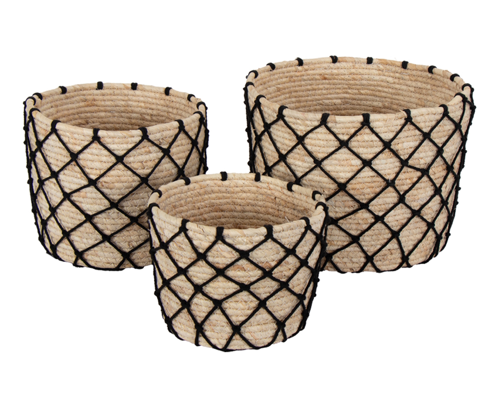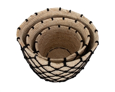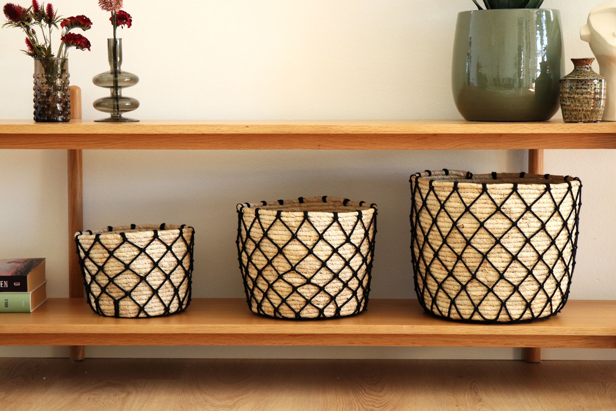 Flätade korgar gjorda av sjögräs - Set med 3 st. Dekorativa flätade korgar med svarta bomullssnören. Sjögräs är känt för sin naturliga värme och hållbarhet, vilket gör det till ett idealiskt material för våra flätade korgar. Det är både miljövänligt och robust, vilket säkerställer att korgarna tål daglig användning.