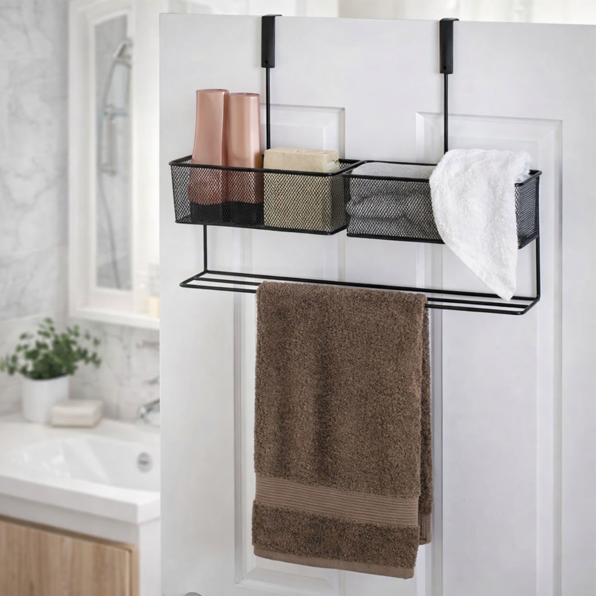 Framsidan »Inredning » Badrumstillbehör » Badrumsförvaring Hängförvaring - Smart förvaring - Svart metallhängare för dörr med 2 korgar - Trådkorg Spara45% Borg Living 449,00249,00SEKSpara 200,- I lager Trustpilot Antal Lägg i varukorgen Se mer från: Borg Living Artikelnummer:SM005 Se vårt utbud av handdukspaket Se vårt utbud av förvaring till badrummet Har du frågor om produkten? Smart upphängning med extra förvaringModernt och minimalistiskt designPlatsbesparande och praktisk lösning Praktisk förvaring till badrummet Typ: Hängförvaring för dörren Totala mått: 35x16x60 cm Korgmått: 10x15x25 cm Material: Pulverlackerat stål Fästdjup (för över dörren): 5 cm Färg: Svart Märke: Borg Living En snygg svart trådkorg med smart upphängning för dörren. Praktisk i rum där det ska vara enkelt med förvaring och lättillgängligt. Använd denna hängförvaring i köket, i badrummet, i barnrummet eller på någon helt annan plats. En smart förvaring med många möjligheter. Denna smarta förvaring är uppbyggd av två korgar och en smart torkmöjlighet med tre rader under korgarna, t.ex. för diskhanddukar, handdukar eller annat. Hängförvaringen är enfärgat svart och tillverkad av pulverlackerat stål. Denna kombination gör korgarna och hela upphängningen mer motståndskraftiga mot repor, bucklor, samt mycket lätta att rengöra. Se vårt stora utbud av hem- och inredningstillbehör Denna dubbla metallkorg i svart stål från Borg Living är ett smart och diskret sätt att organisera saker. Oavsett om du ska använda den i ett litet rum, på kontoret, i badrummet eller i köket, är denna dörrkorg en praktisk förvaringslösning som inte kräver mycket plats. Utnyttja utrymmet på dörren på ett smart och dekorativt sätt med denna metalkorg med upphängning för dörren. Denna smarta förvaring är designad för att hänga på dörren utan att använda skruvar eller hål, vilket ger dig möjlighet att effektivt använda utrymmen som du kanske normalt inte skulle använda. Du får extra förvaringsplats utan att behöva använda golvytan och detta har stort värde för många, t.ex. i små rum eller utrymmen. Detta är särskilt praktiskt i mindre rum där utrymmet är begränsat. Det enkla och stilfulla designen gör att den passar in i vilken inredning som helst. Den svarta färgen är tidlös och elegant, och det minimalistiska uttrycket gör att den passar i de flesta miljöer. Dessutom är korgen lätt att dekorera, t.ex. med en ljusslinga, en blomma eller annat som ger en ombonad finish. Se alla våra smarta förvaringslösningar via länken här Tillbaka till Badrumsförvaring