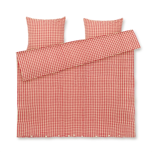 Den mjuka bomullen i kombination med den skrynkliga strukturen ger en unik känsla av lyx. Samtidigt är sängkläderna praktiska i vardagen, eftersom de inte kräver strykning och behåller sitt fina uttryck tvätt efter tvätt. De diskreta rutorna i rött ger ett lugnt och stilrent utseende som passar både moderna och klassiska sovrum.