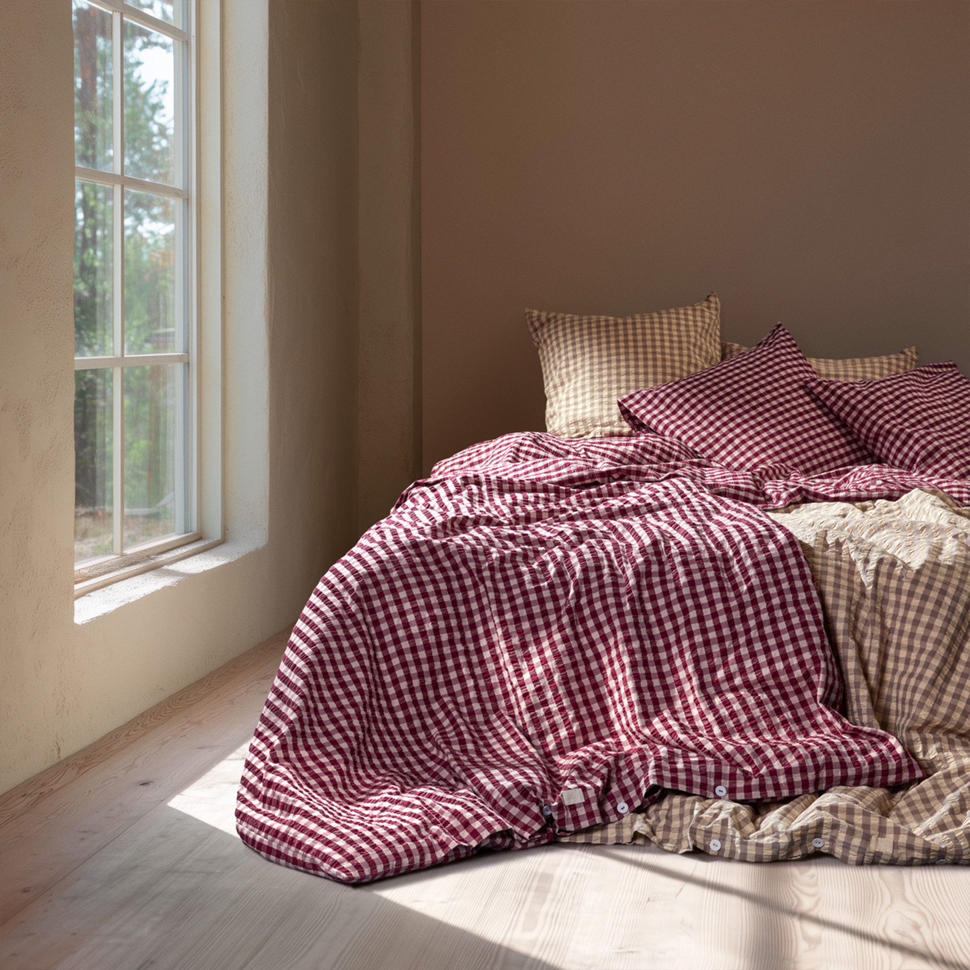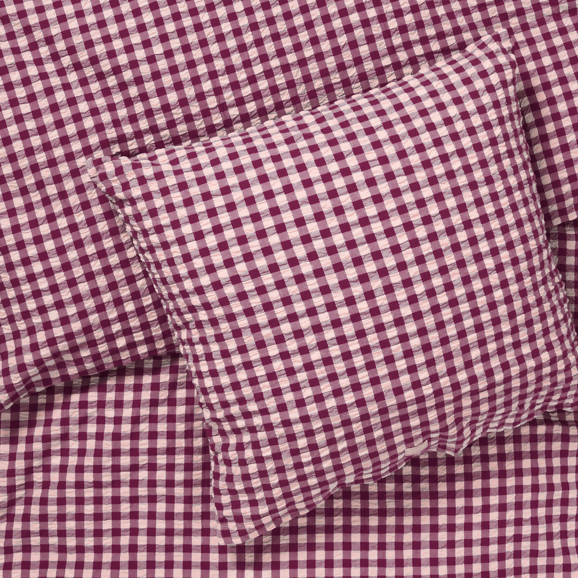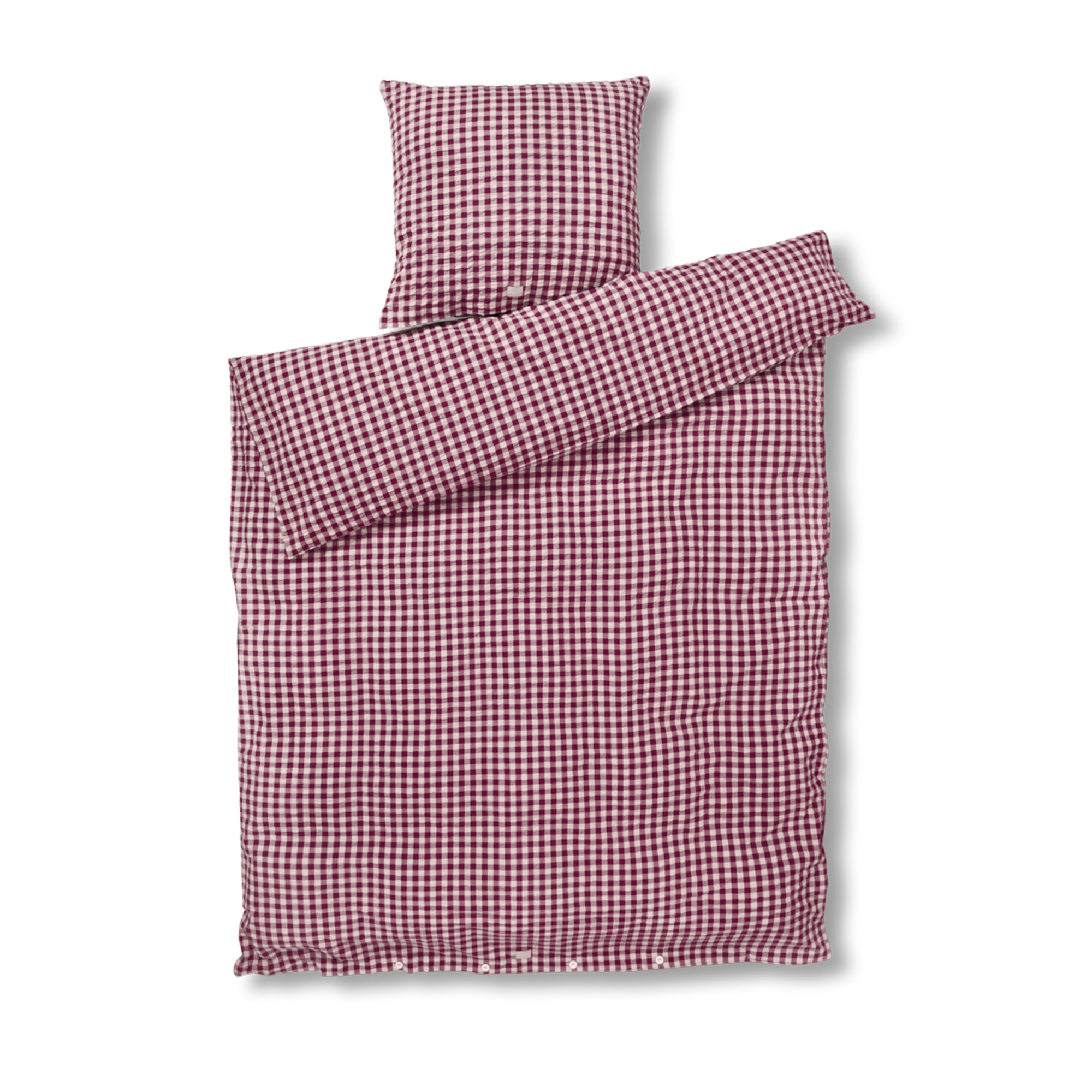 Den mjuka bomullen i kombination med den skrynkliga strukturen ger en unik känsla av lyx. Samtidigt är sängkläderna praktiska i vardagen eftersom de inte kräver strykning och behåller sitt fina uttryck tvätt efter tvätt. De fina rutor i plommon och rosa ger ett lugnt och stilrent utseende som passar både moderna och klassiska sovrum.
