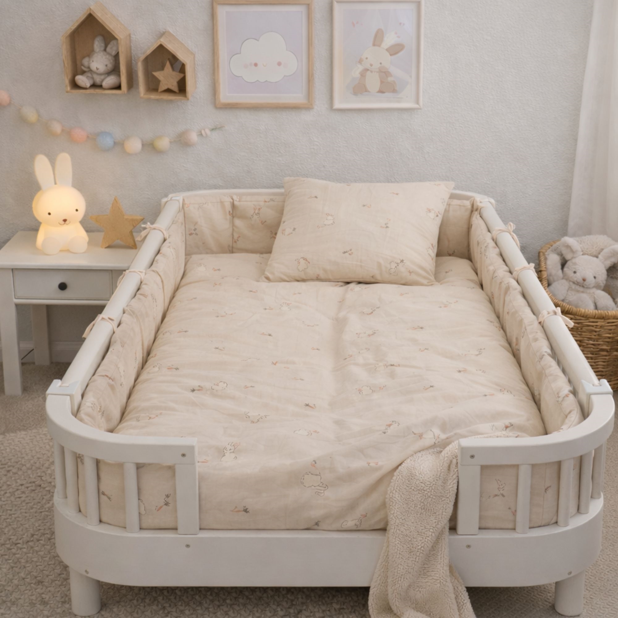 Detta fina juniorpåslakanset har en söt och lugn design med små kaniner, morötter och diskreta blomdetaljer. Den mjuka beigea bakgrunden ger setet ett naturligt och harmoniskt uttryck som passar perfekt i ett mysigt barnrum.