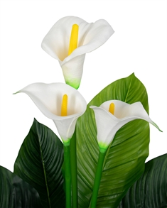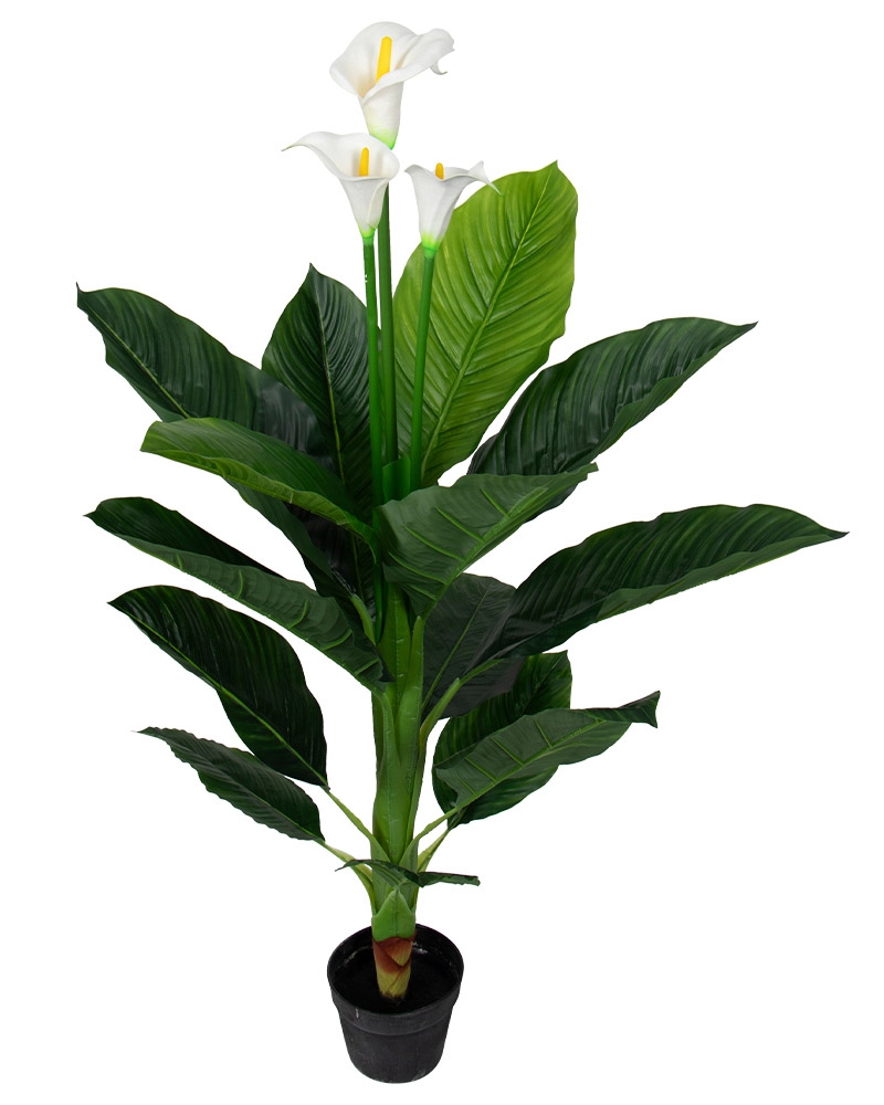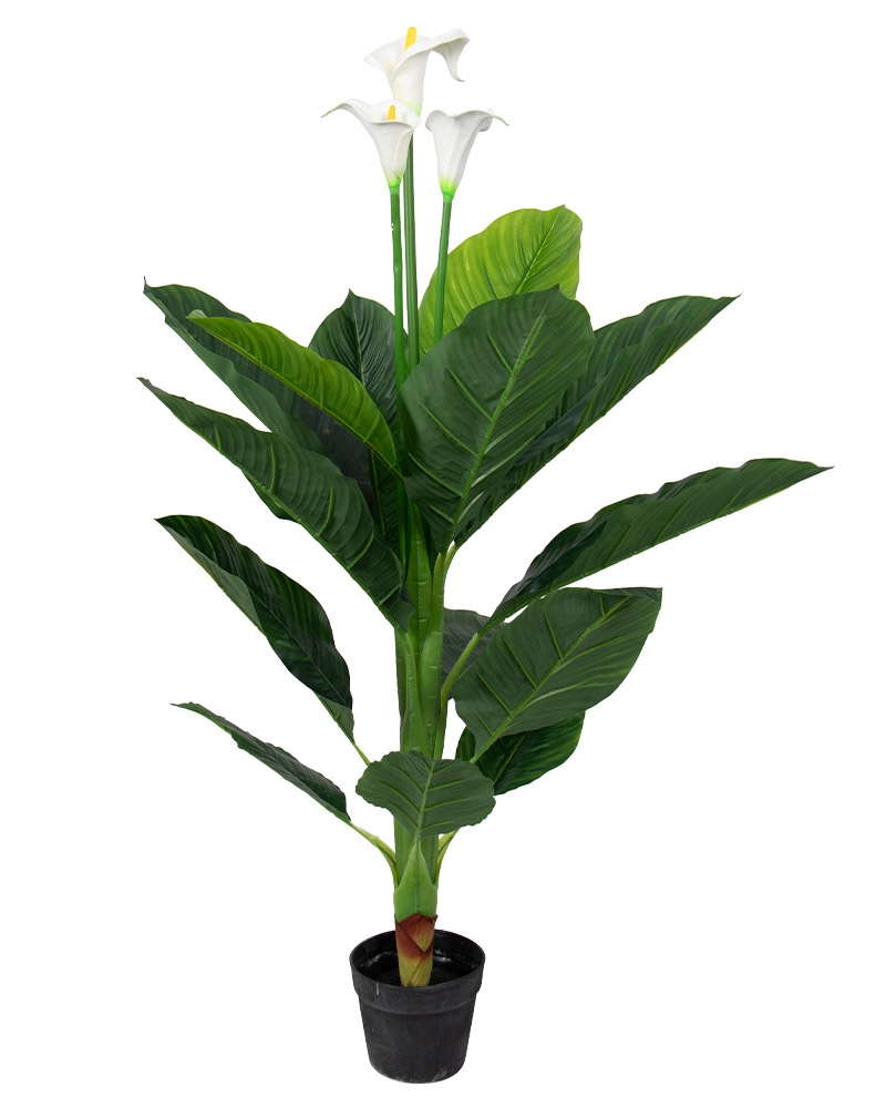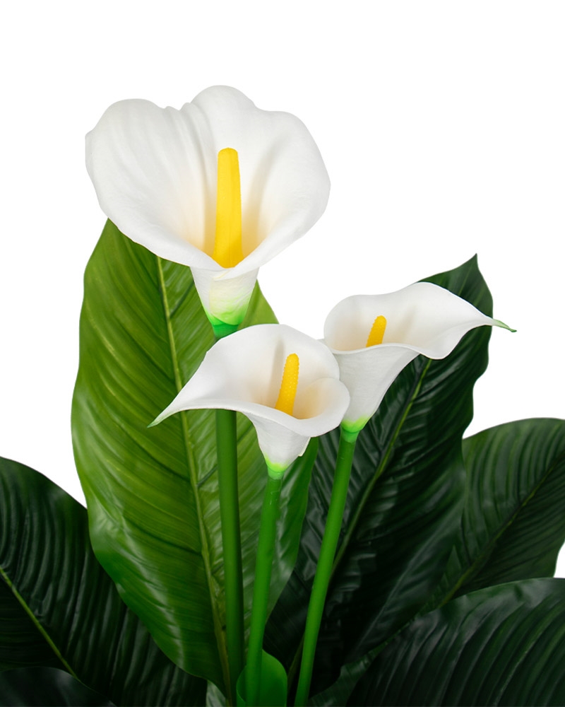 Upptäck skönheten i vår konstgjorda vita Calla-växt, ett perfekt tillskott till ditt hem. Med tre verklighetstrogna blommor i full blom är denna växts 120 cm höjd och 65 cm diameter en vacker och rik dekoration för hemmet.