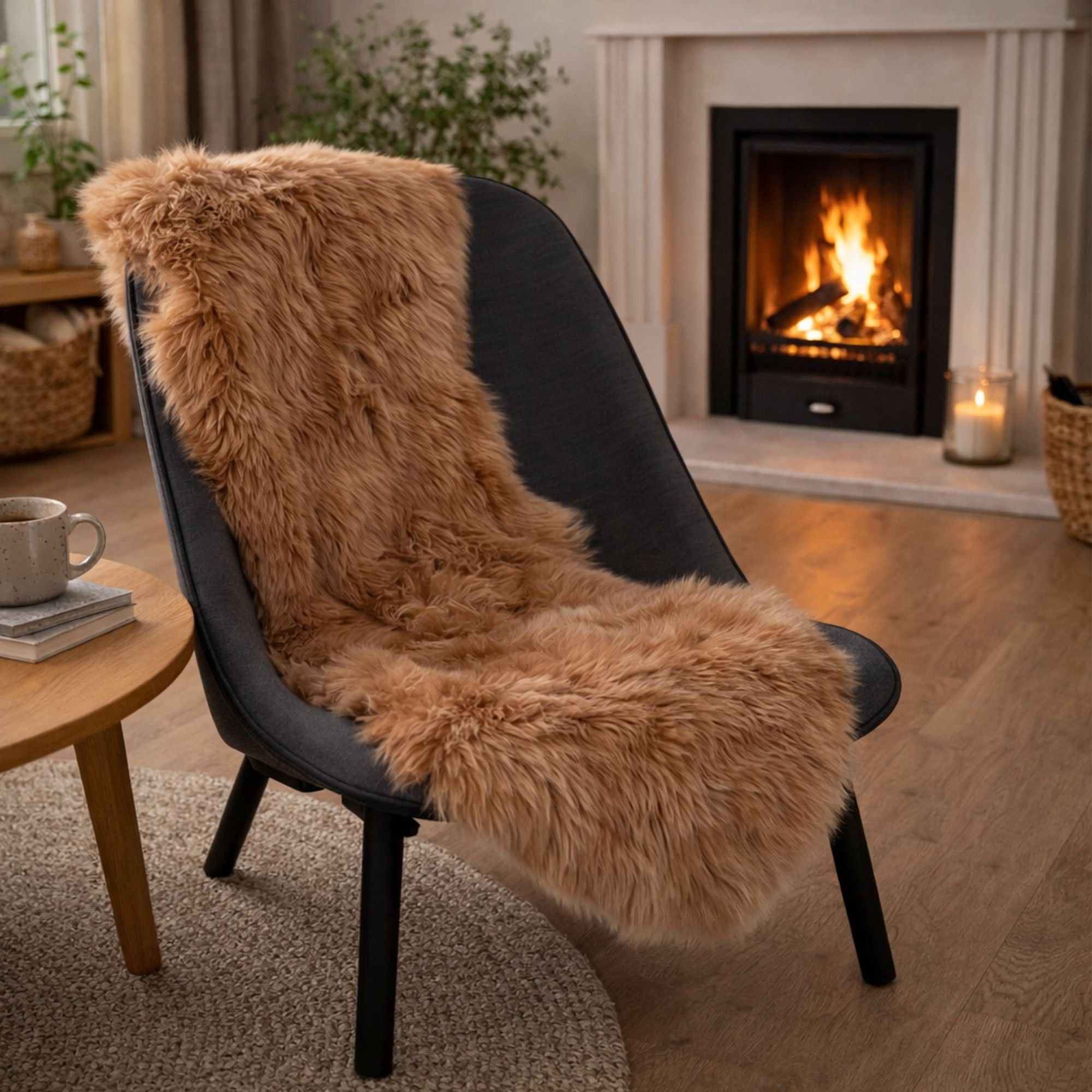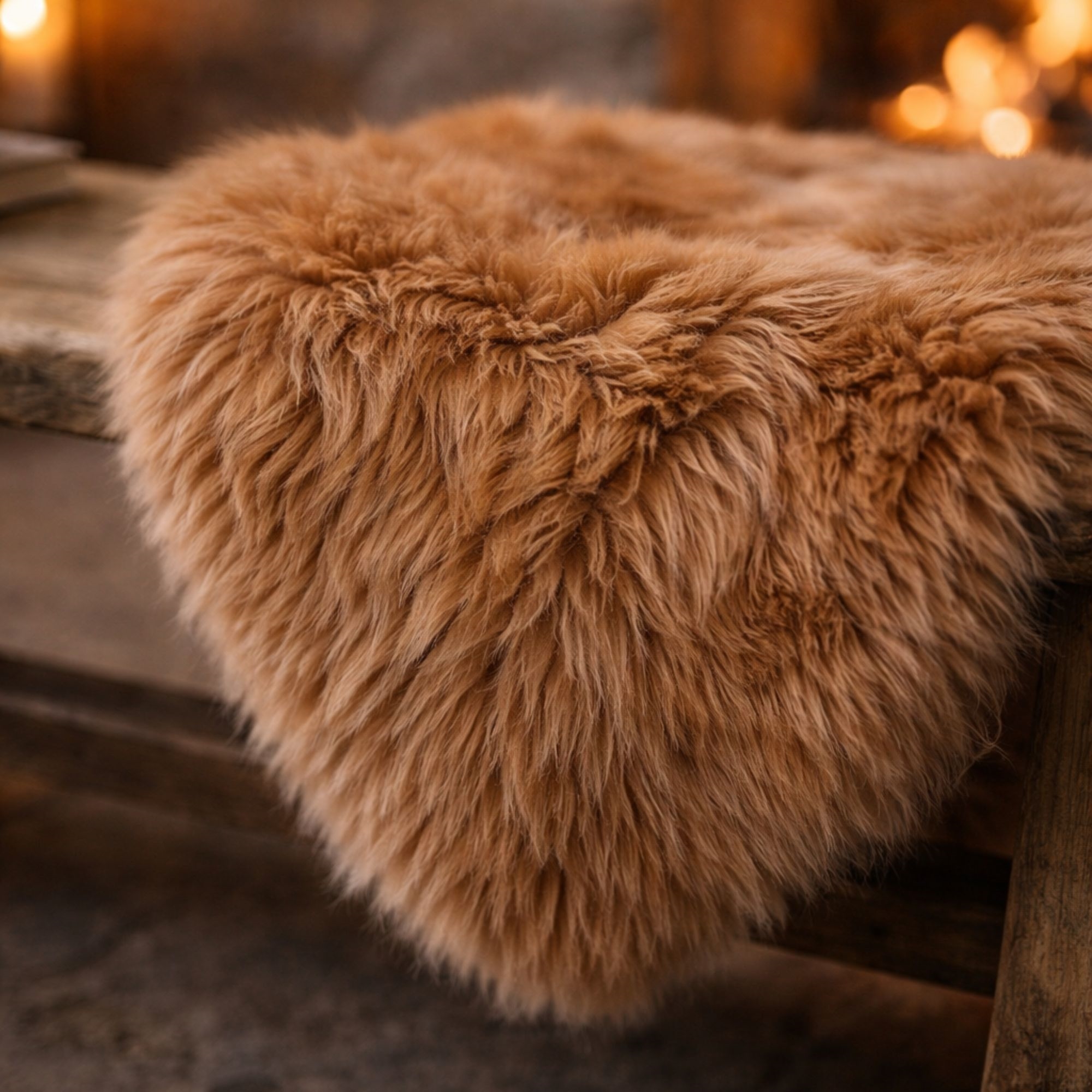 Vårt imiterade lammskinn ger ditt hem en touch av elegans. Med sin ljusbruna färg och mjuka textur är det både visuellt tilltalande och behagligt att röra vid. Detta lammskinn är idealiskt för inomhusbruk, perfekt för att lyfta din stol eller som ett mysigt täcke i vardagsrummet, sovrummet eller barnrummet.