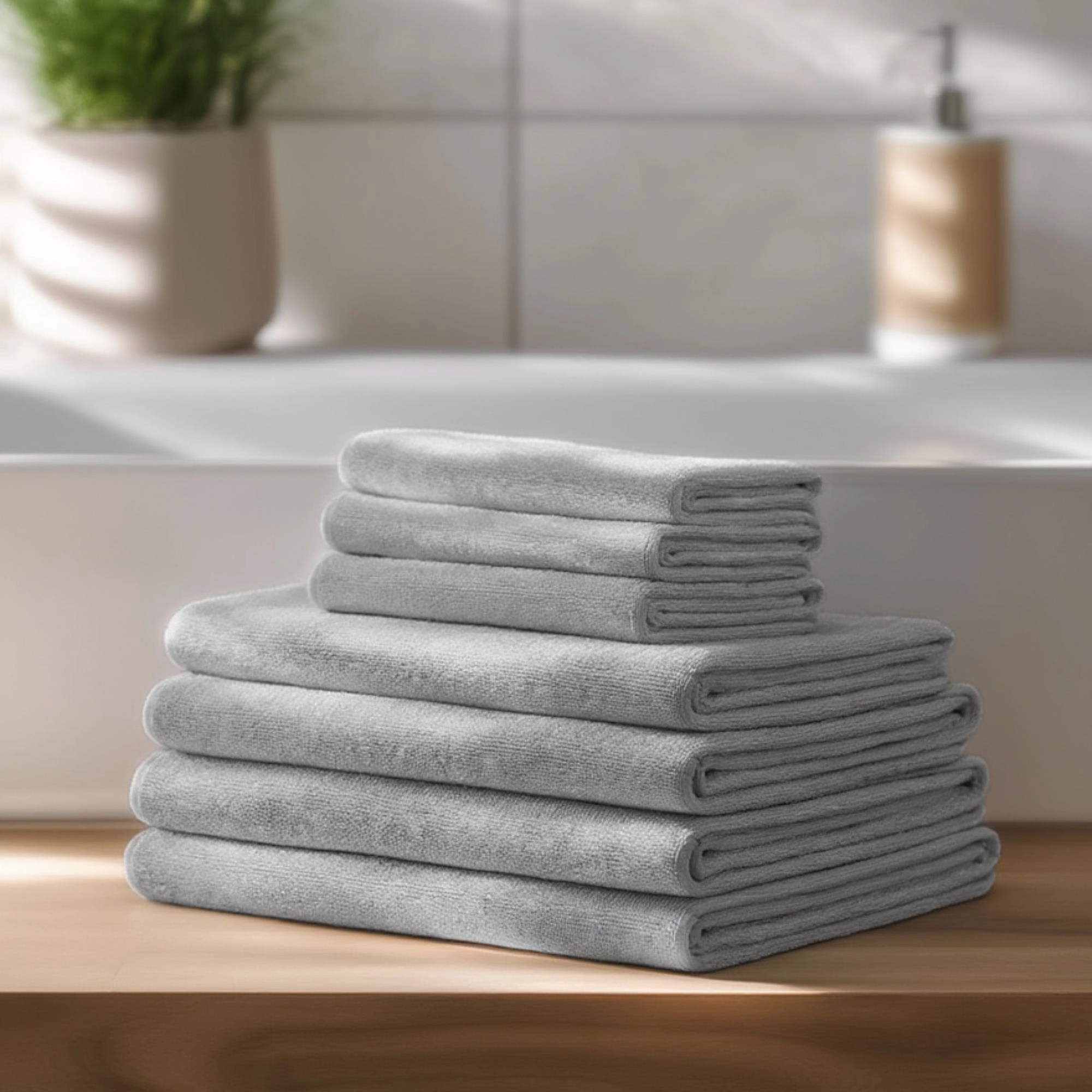 Slipp tunga och långsamtorkande handdukar - med dessa ljusgrå microfiberhanddukar får du en lätt och praktisk lösning som passar perfekt för en aktiv vardag. Den mjuka microfibern känns behaglig mot huden och absorberar effektivt, så du snabbt blir torr - oavsett om du är på gymmet, simhallen eller på resande fot. Handdukarna torkar snabbt och tar minimalt med plats, vilket gör dem idealiska både i sportväskan och resväskan. Perfekta för dig som vill ha funktion utan att kompromissa med komfort. Den ventilerande kvaliteten motverkar fukt och lukt, så handdukarna känns fräscha om och om igen. Ett smart och hygieniskt val för både träning, resa och vardagsbruk. I denna 8-pack får du 4 handdukar i storlek 70x140 cm och 4 st i storlek 50x100 cm.