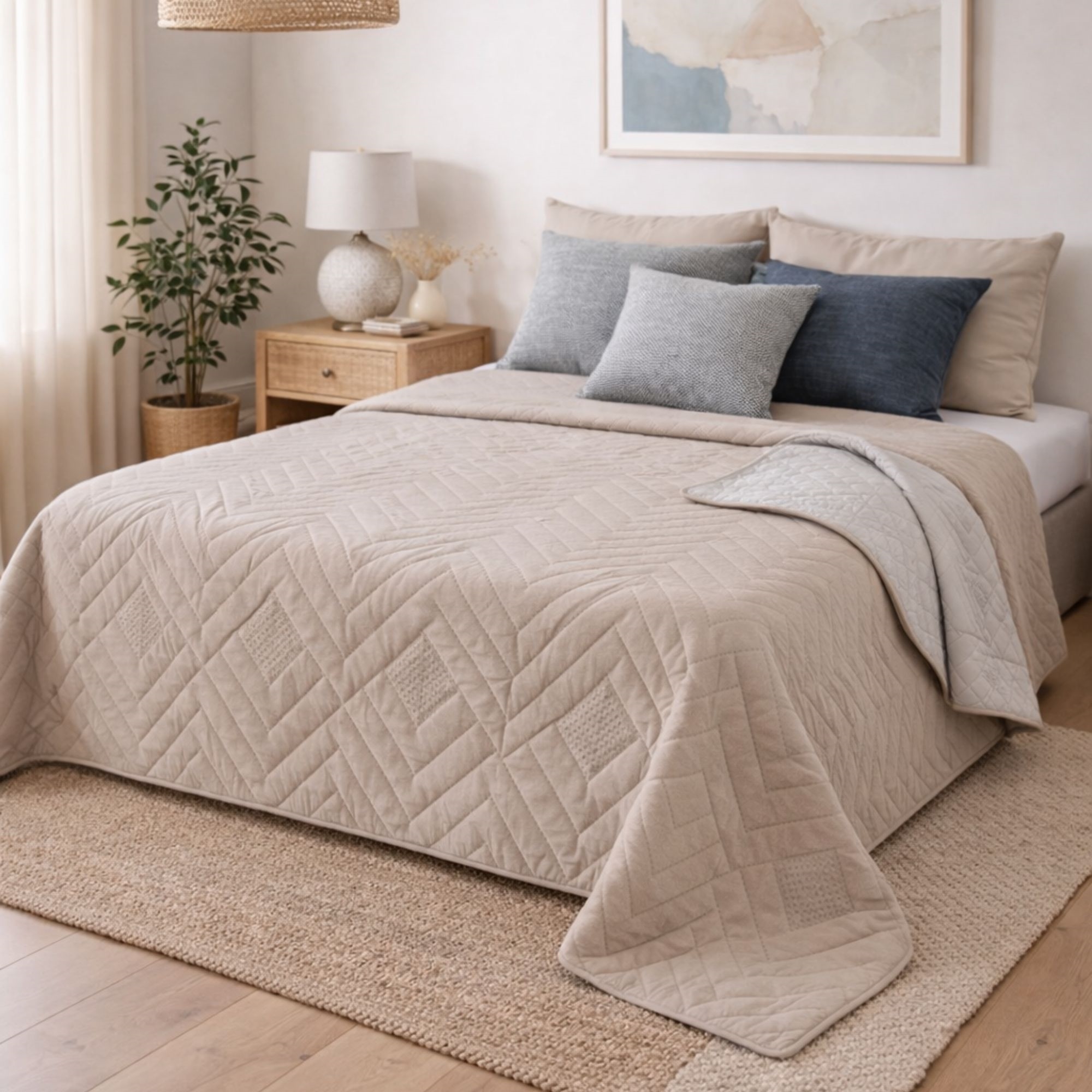 Framsidan »Inredning » Textilier » Överkast Överkast - 140X240 cm - Vändbart sandfärgat och vitt - Överkast för enkelsäng Spara40% Borg Living 749,00449,00SEKSpara 300,- I lager Trustpilot Välj storlek Välj alternativ Antal Lägg i varukorgen Se mer från: Borg Living Artikelnummer:ST1001 Se vårt utbud av gavelkuddar Se vårt utbud av badrockar för hela familjen Se vårt stora utbud av hemtillbehör Har du frågor om produkten? Vändbar design i två snygga färgerTillverkad i lätt och slätt polyester materialCertifierad med STANDARD 100 by OEKO-TEX® Storlek: 140x240 cm Typ: Passar enkelsäng Färg:Vändbar - Sandfärgad och vit Design: Borg Living Överdrag: Polyester Tvätt: 30° Certifiering: STANDARD 100 by OEKO-TEX® (19. HCN. 74736 HOHENSTEIN HTTI) Vändbart överkast Detta eleganta överkast från Borg Living erbjuder ett enkelt sätt att uppdatera ditt sovrum. Med sin vändbara design kan du ändra utseendet på ditt rum med ett enkelt grepp. Detta överkast är både praktiskt och snyggt. Polyester Polyester är känt för sin hållbarhet och enkla underhåll. Det är ett lätt material som är lätt att rengöra, vilket gör det till ett idealiskt val för överkast då det tål daglig användning och ändå ser nytt ut. Polyester är också känt för att vara allergivänligt, vilket gör det till ett bra val för personer med allergier eller astma. Vändbar design En annan fördel med detta överkast är dess vändbara design. Detta gör att du enkelt kan ändra utseendet på ditt sovrum utan att behöva köpa ett nytt överkast. Du kan helt enkelt vända på det för att avslöja en annan färg, vilket ger ditt rum ett helt nytt utseende. Det här är ett smart sätt att hålla ditt sovrum fräscht och modernt. Överväg att titta i vår kategori textilier. Det danska varumärket Borg Living producerar exklusiva serier av täcken, kuddar och hemtextilier till ditt hem. Varumärket som etablerades 2013 är känt för sin innovation inom kvalitet och design. Borg Livings fantastiska produkter bidrar till en optimal och bekväm nattsömn samt dekorerar ditt hem med moderna och stiliga hemaccessoarer. Tillbaka till Överkast