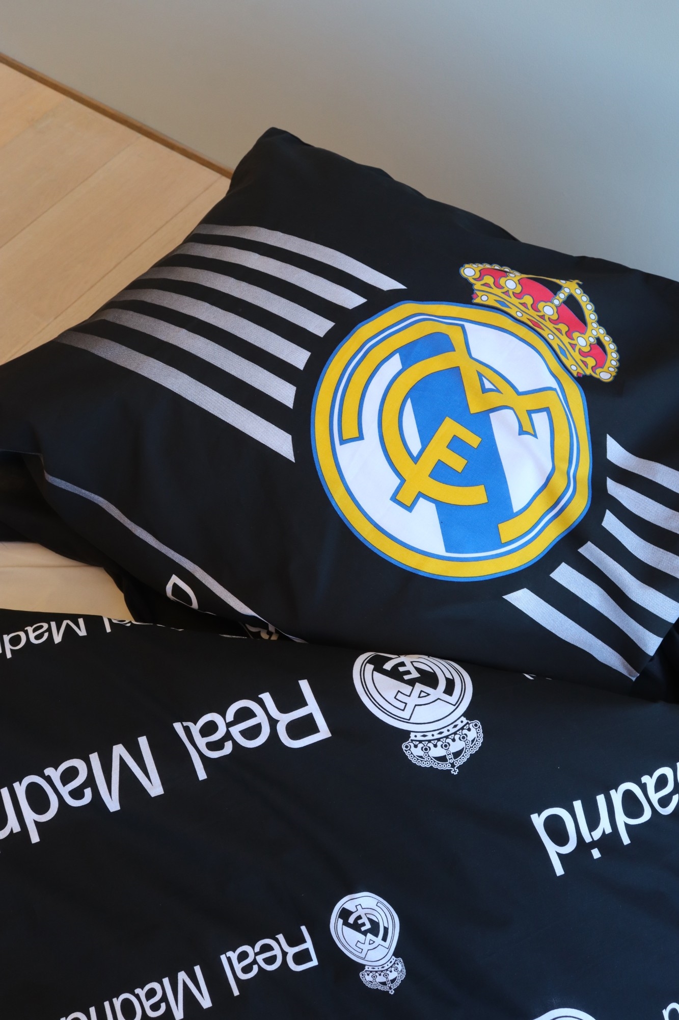 Framsidan »Sängkläder » Sängkläder för barn » Sängkläder för Barn 140x200 cm Real Madrid sängkläder - 100% bomull - Barnsängkläder 140x200 cm - Svart fotbollssängkläder Spara20% Licens 499,00399,00SEKSpara 100,- I lager Trustpilot Antal Lägg i varukorgen Se mer från: Licens Artikelnummer:2973-1 Läs vår sängklädesguide Se vårt stora utbud av lakan Se vårt stora utbud av täcken Har du frågor om produkten? Mjuk kvalitet som känns bekväm hela nattenAndningsbart material som ger en bekväm sömnVändbart design för två looks Påslakan: 140x200 cm Örngott: 60x63 cm Material: 100% mjuk bomull Färg: Svart Design: Real Madrid Vändbar: - Framsida: Tryck med Real Madrids logotyp - Baksida: Helt tryck med små logotyper Stängning: Påslakan med knappar och örngott med överlapp Tvätt: 60° Torktumling: Ja Tål strykning: Ja Certifiering: STANDARD 100 by OEKO-TEX® (17.HPK.23879). Din garanti för att produkten är fri från hälsofarlig kemi. Real Madrid sängkläder 140x200 cm – Svart vändbart sängset för fotbollsfans Detta barnsängset är tillverkat i 100% mjuk bomull som kombinerar hög komfort med slitstark kvalitet. Den rena bomullen gör sängkläderna andningsbara och behagliga mot huden, så ditt barn får de bästa förutsättningarna för en god och trygg nattsömn. När du väljer barnsängkläder i 100% bomull får du: Mjuk och behaglig kvalitet mot huden Hög andningsbarhet för en hälsosam sovmiljö Slitstarkt material som håller tvätt efter tvätt Barnsängkläder måste klara en hel del. Därför kan vår bomullssängkläder tvättas i 60°, vilket bidrar till att säkerställa en hög hygiennivå. Den höga tvättemperaturen hjälper till att ta bort bakterier och håller sängkläderna fräscha och rena. All vår barnsängkläder i 140x200 är OEKO-TEX certifierade. Det är din garanti för att sängkläderna är testade och fria från skadliga kemikalier. När du väljer OEKO-TEX certifierade sängkläder väljer du trygghet och säkerhet för ditt barn. Gör läggdags till en seger med detta Real Madrid påslakanset 140x200 cm i svart färg. Perfekt för barn och ungdomar som älskar Real Madrid och vill visa sin passion för fotboll på rummet. Utforska favoriterna och mycket mer i vårt stora utbud av tillbehör till barnrummet Tillbaka till Sängkläder för Barn 140x200 cm