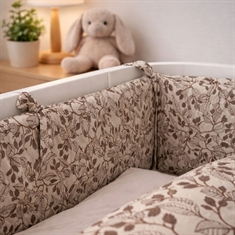 Det mjuka överdraget och det fina bladmönstret i beige nyanser skapar ett mysigt och barnvänligt uttryck i spjälsängen. Sängkantskyddet fästs enkelt med de påsydda knytbanden så att det sitter kvar säkert på plats.