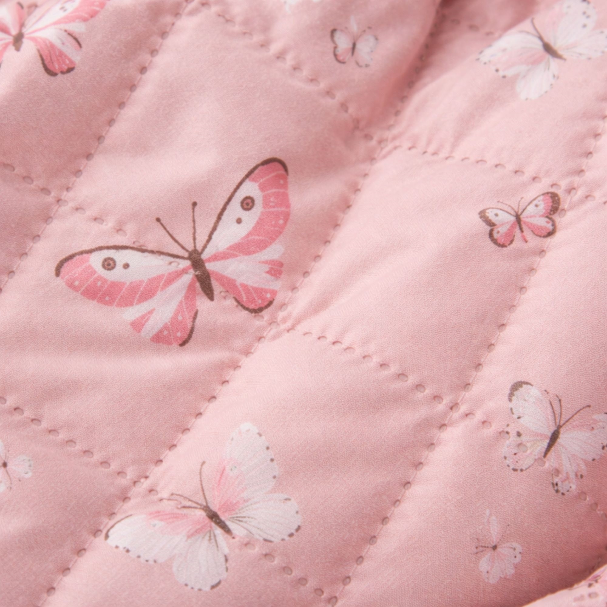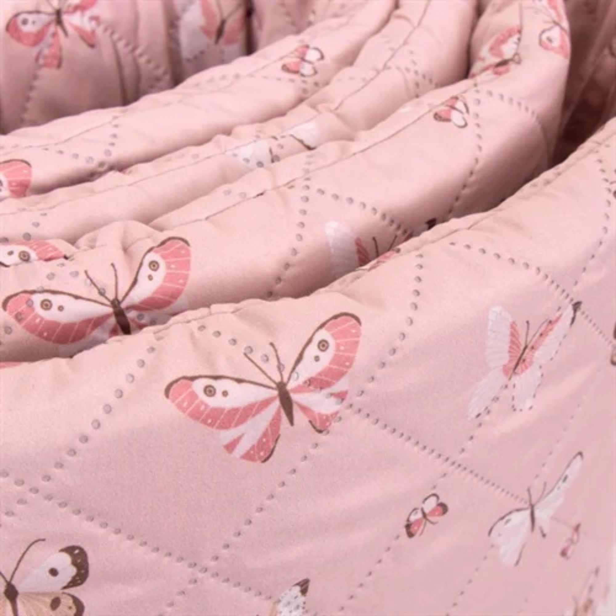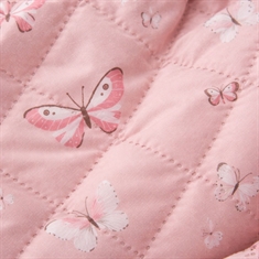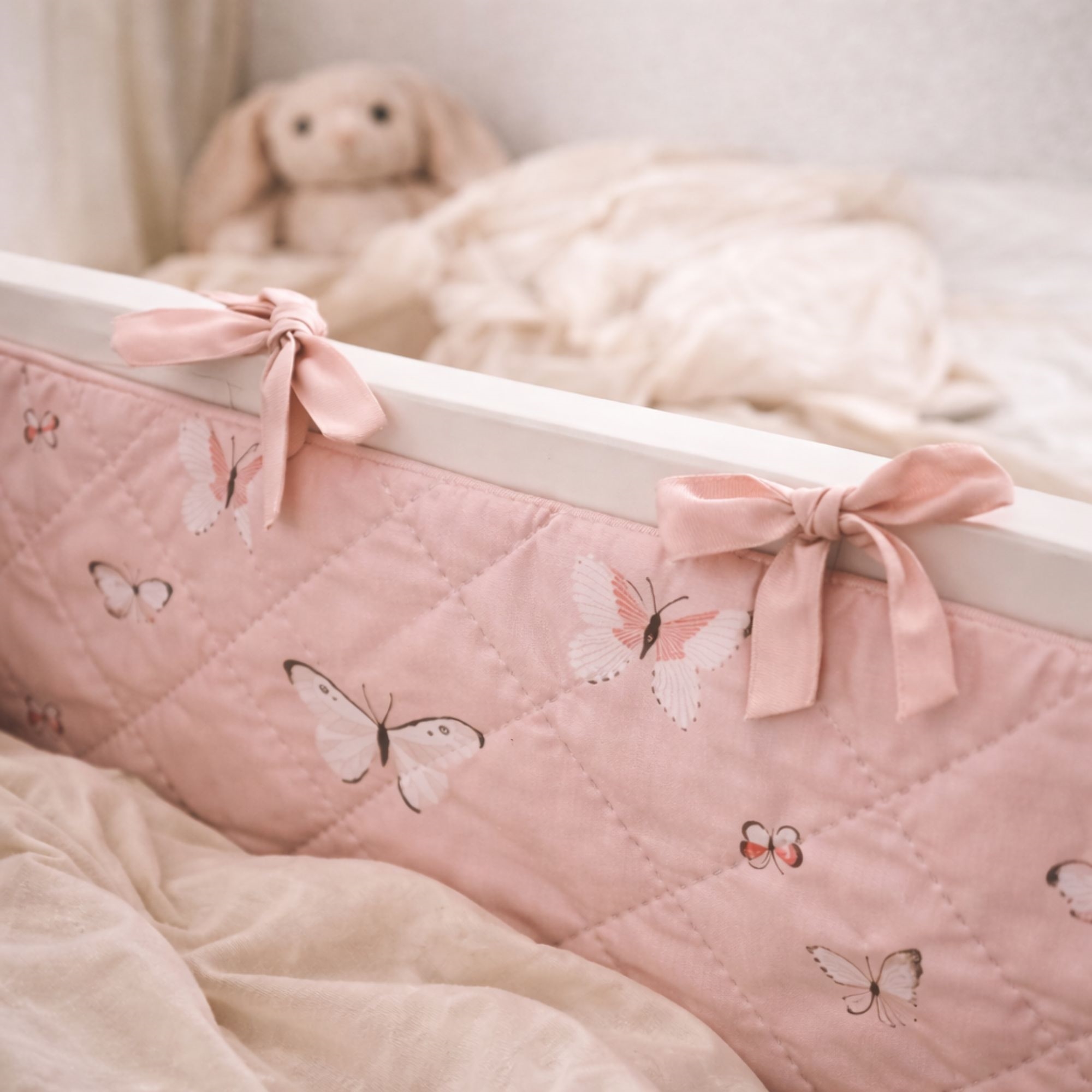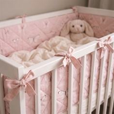 Det mjuka överdraget och det fina fjärilsmönstret i ljusrosa nyanser skapar ett mysigt och barnvänligt uttryck i spjälsängen. Sängkantsskyddet fästs enkelt med de påsydda knytbanden, så att det sitter säkert på plats.