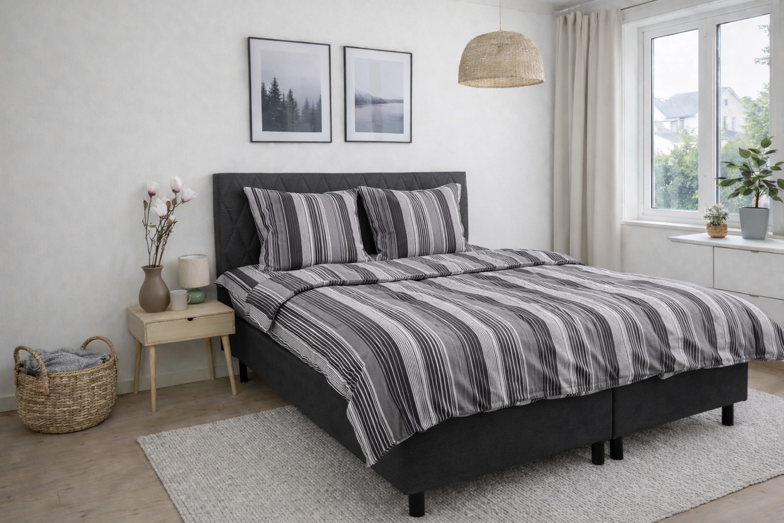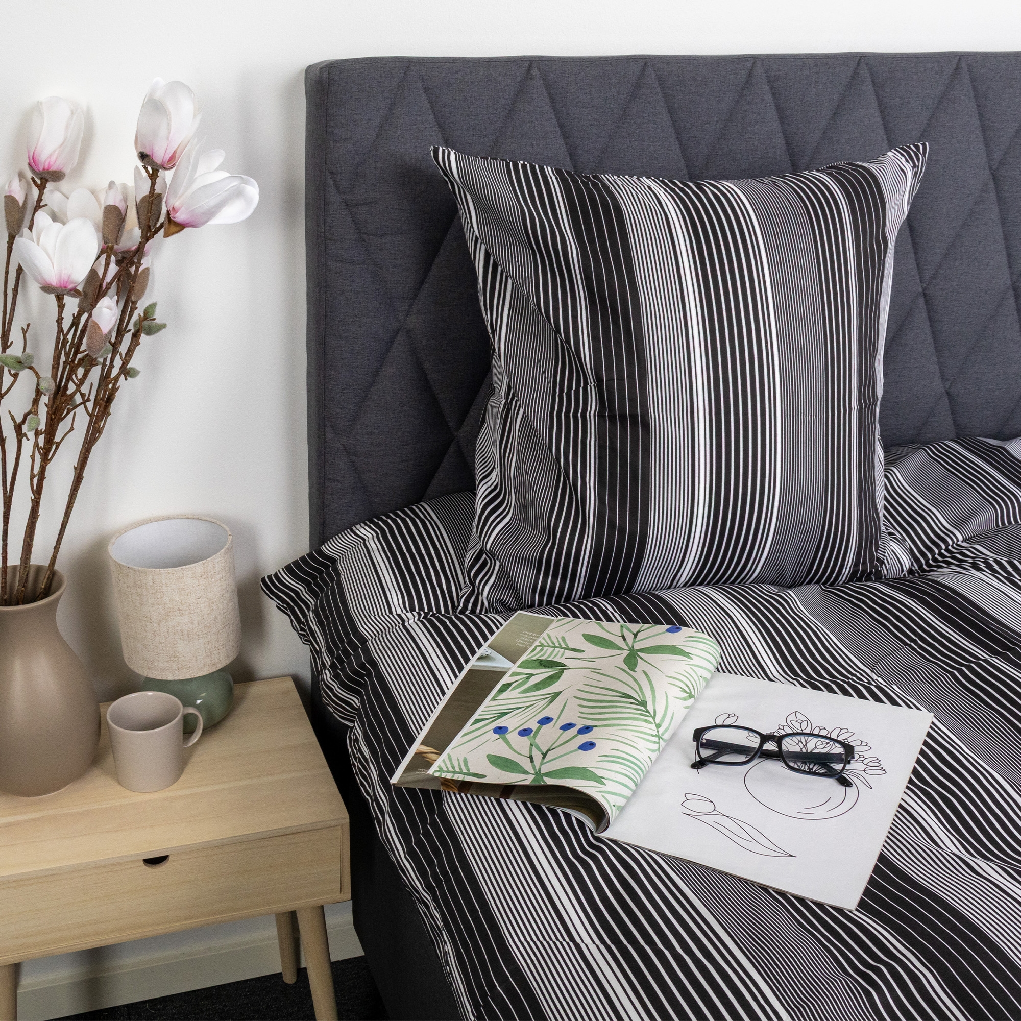 Både påslakan och örngott stängs med invändig dragkedja, vilket säkerställer att täcket och kudden hålls på plats och gör det enkelt att byta sängkläder. Det randiga uttrycket skapar ett lugnt och dekorativt intryck som passar i både moderna och klassiska sovrum.