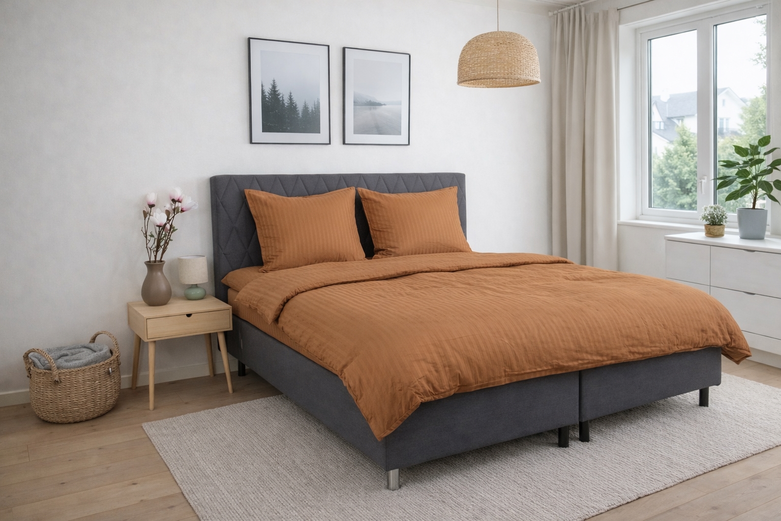 De jacquardvävda ränderna är vävda direkt in i tyget och skapar ett diskret spel mellan matta och blanka ytor. Denna vävteknik ger sängklädet struktur och djup utan tryck och säkerställer att mönstret förblir fint och enhetligt även efter upprepad tvätt. Den enfärgade designen gör det enkelt att få setet att passa in i alla typer av inredning.