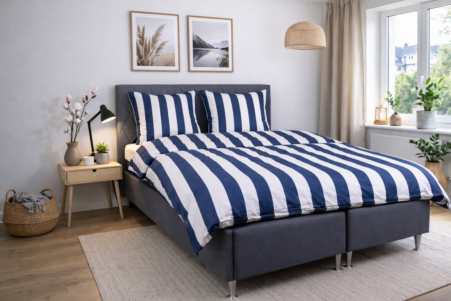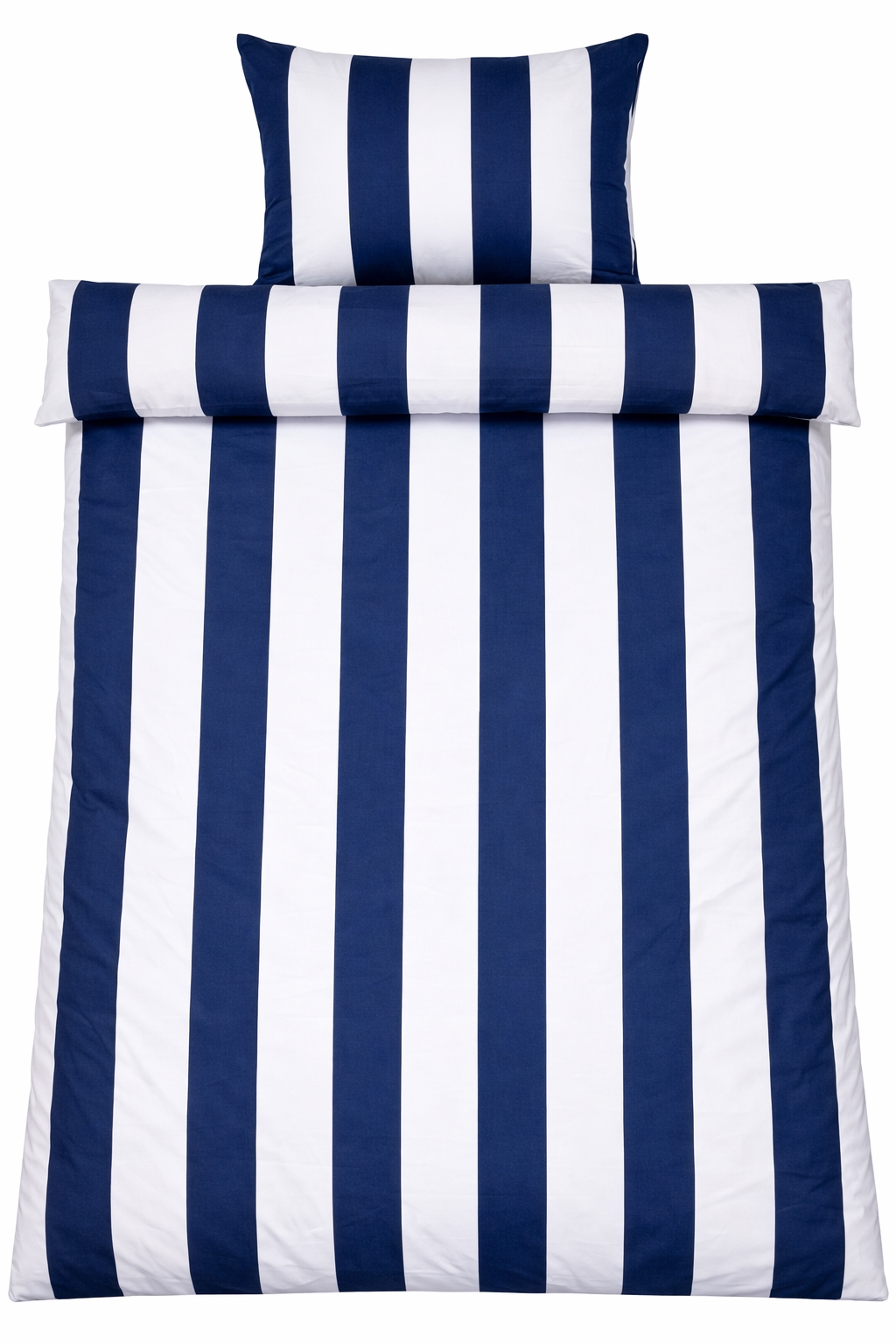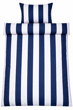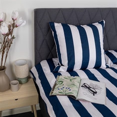 Det bredrandiga trycket ger ett skarpt och harmoniskt uttryck. Kombinationen av blå och vita ränder ger sovrummet ett avslappnat och lugnt uttryck, samtidigt som designen är lätt att kombinera med olika kuddar.
