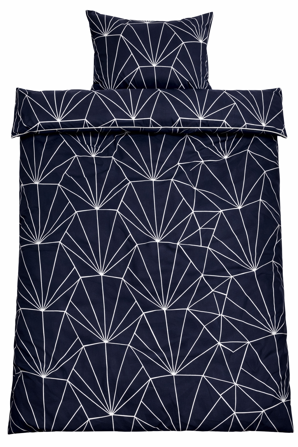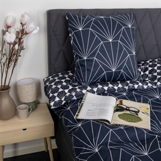 Det vändbara designet ger dig två olika looks i ett sängset. Framsidan är dekorerad med ett modernt grafiskt mönster, medan baksidan har ett mer nedtonat geometriskt uttryck. Det gör sängkläderna lätta att kombinera med olika färger, kuddar och plädar och ger större flexibilitet i inredningen.