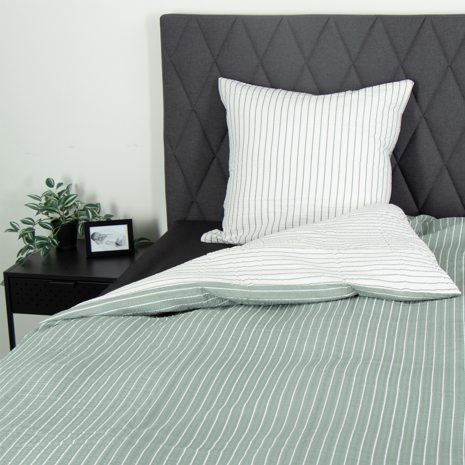 Framsidan »Sängkläder Sängkläder 200x220 cm - Grön- och vitrandiga sängkläder - Bäckebölja - sängkläder för dubbeltäcke - 100 % bomull - By Night 2 x kuddfodralSpara31% By Night 1.299,00899,00SEKSpara 400,- I lager Trustpilot Antal Lägg i varukorgen Se mer från: By Night Artikelnummer:264-5 Läs vår sängkläderguide Se vårt stora utbud av lakan Se vårt stora utbud av täcken 200x220 Har du frågor om produkten? Sängkläder - 200x220 cm100 % bomullscrepeBäckebölja - Grön och vit Påslakan: 200x220 cm Örngott: 2 st. á 60x63 cm Material: 100% bäckebölja - bomullscrepe Vävning: 200 TC (Trådtäthet = antal trådar per kvadrattum) Färg: Grön och vit Design: Randigt - vit och grön Varumärke: By Night Stängning: Täcke- och kuddfodral med dragkedja Tvätt: 60° Torktumling: Ja Tål strykning: Ja Certifiering: STANDARD 100 by OEKO-TEX® (2018OK0658) Sängkläder i bäckebölja, också kallat bomullscrepe, är slättvävt bomullstyg med applicerad rynkeffekt, vilket ger sängkläderna ett vackert utseende som inte kan tvättas bort. "By Night" sängkläder i bäckebölja är tillverkade i 100 % bomull. Bäddsetet är färgäkta vilket betyder att det behåller färgen efter flera tvättar. Bäddsetet är dubbelsidigt med olika färger på fram- och baksidan, vilket skapar en vacker balans mellan färger och mönster. Köp extra kuddfodral här Fräscha upp sängen och sovrummet med ett snyggt och lyxigt set sängkläder som detta. Passa även på att höja sömnkomforten med ett nytt mjukt lakan av hög kvalitet. Du hittar vårt stora sortiment av kvalitets lakan här By Night karaktäriseras av dansk design och erbjuder bekväma sovkomponenter av högsta kvalitet för din nattsömn. By Night producerar sängkläder och lakan för hela familjen och lägger stor vikt vid aktuella trender, vilket gör att produktionen alltid involverar moderiktiga färger och mönster. Tillbaka till Sängkläder