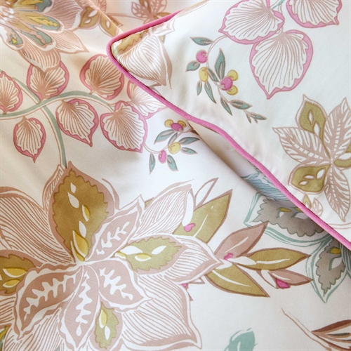 Detta blommiga sängset är tillverkat av 100% bomull och vävt med en satinväv, vilket ger setet en slät, mjuk och lyxig yta med en lätt glans. Satinvävningen innebär att tyget har fler trådar på ytan, vilket resulterar i en mer glansfull och silkeslen känsla. Det gör sänglinnet inte bara behagligt mot huden, utan också elegant att se på, vilket ger sovrummet ett exklusivt uttryck. Den höga kvaliteten på bomullen säkerställer att materialet både är luftigt och fuktabsorberande, vilket skapar en behaglig sovmiljö hela natten - varmt på vintern och svalt på sommaren. Bomullens naturliga egenskaper gör samtidigt sänglinnet slitstarkt och lätt att underhålla, även efter upprepade tvättar.