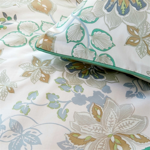 En särskild detalj i detta sänglinne är den eleganta pipingkanten på örngottet. Pipingskanten är en fin sydd kant i kontrastfärg som ramar in kudden och ger ett sofistikerat och genomfört utseende. Denna detalj ger örngottet ett mer strukturerat och stilfullt uttryck.