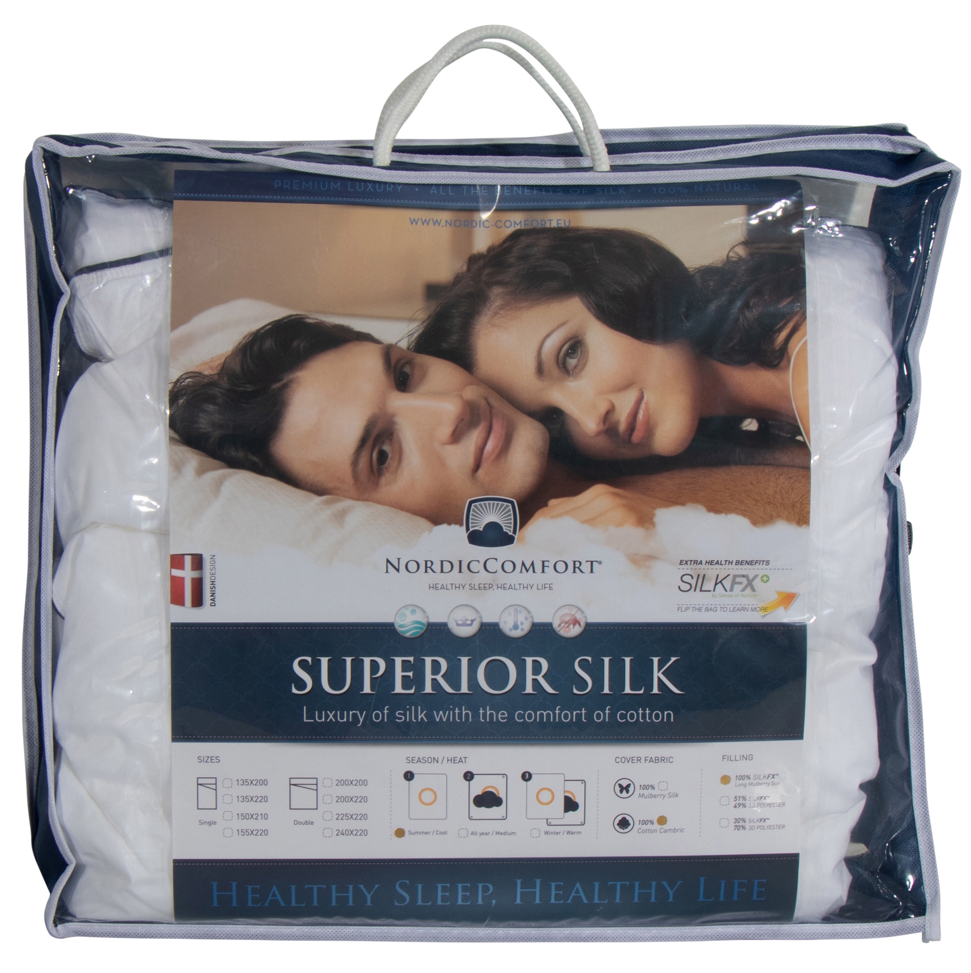 Framsidan »Täcken » Typ av täcke » Silkestäcken Sommartäcke 240x220 cm - Nordic Comfort Superior långfibrigt täcke i silke - king size dubbelt täcke Spara33% Nordic comfort 5.999,003.999,00SEKSpara 2.000,- Fri frakt på denna varaI lager Trustpilot Antal Lägg i varukorgen Se mer från: Nordic comfort Artikelnummer:6401 Läs vår täckesguide Läs om underhåll av täcken och kuddar Se vårt stora utbud av kuddar Har du frågor om produkten? Täcke i silke - Nordic Comfort - Superior SilkLevereras i exklusiv väska100 % långfibrigt mullbärssilke Storlek: 240x220 cm - täcke i king size-storlek Typ: Sommartäcke - svalt täcke Varumärke: Nordic Comfort - Superior sommartäcke i silke Silkestäthet: 150 g m2 Fyllnadsvikt: 795 g Fyllning: Långfibrigt mullbärssilke Yttertyg: Mjuk exklusiv tätvävd bomullskambric Tvätt: Ja, kan tvättas i maskin (Viktigt att använda enzymfritt tvättmedel) Torktumling: Bör ligga och torka Garanti: 10 år Certifiering: STANDARD 100 by OEKO-TEX® (SHHO 090844) Se alla våra silkeskuddar här SuperiorSilk-täcket är tillverkat av SilkFX, som är långfibrigt mullbärssilkefyllning och med 100% bomullscambric utanpå. Cambric-fodret i bomull gör att täcket känns mer som ett traditionellt täcke och är tyngre än till exempel Silk Excellence-täcket med silkefoder. Superior Silk-täcket har SilkFX-teknik så att du enkelt kan tvätta täcket hemma. Vi rekommenderar Superior Silk-täcket till dig som vill ha ett högkvalitativt täcke med silkets fördelaktiga egenskaper och bekvämligheten att kunna tvätta det hemma. Detta täcke i silke har 10 års garanti. Nordic Comfort® är Danmarks mest sålda sommartäcke i silke! Det finns naturligtvis en anledning till det. Egenskaper: Lyxig silkesfiber Upplev den ultimata sovmiljön Temperaturreglerande Förbättrar hälsosam och djup sömn genom att anpassa sig till din kroppstemperatur Allergivänligt Stöter bort husdammskvalster och allergener – färre allergiska reaktioner Antibakteriell Renare och hälsosammare sovmiljö Fuktabsorberande Minskar nattsvett och fuktig sovmiljö Andningsförmåga Låter din kropp andas naturligt och minskar överhettning på natten Nordens mest sålda silkeprodukter är från Nordic Comfort. Varumärket grundades 2007 och har som mål att producera ett noggrant utvalt silkesortiment av högsta kvalitet för konsumenten. Med hjälp av deras sömnexperter kan du uppnå en optimal och förbättrad nattsömn. Tillbaka till Silkestäcken