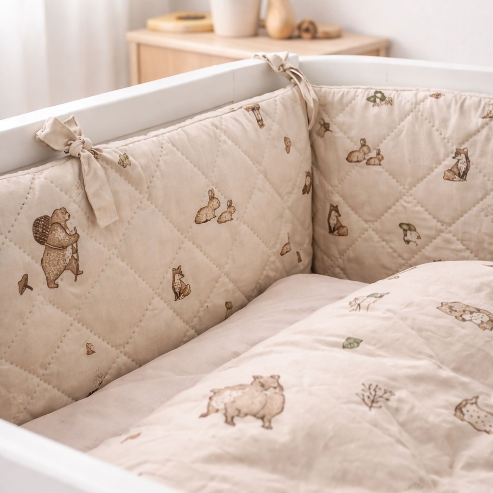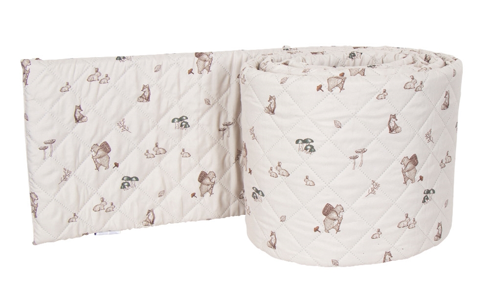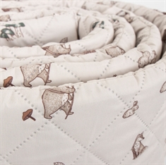 Det mjuka överdraget och det fina trycket med skogens djur i sandfärgade nyanser skapar ett mysigt och barnvänligt uttryck i spjälsängen. Spjälskyddet fästs enkelt med de påsydda knytbanden, så att det sitter säkert på plats.