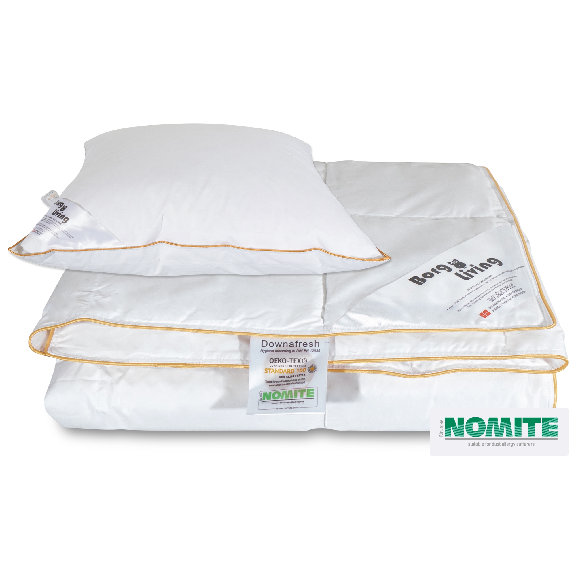 Framsidan »Täcken » Värmeklass » Sommartäcken Täcke och kudde - 150x210 cm sommartäcke + kudde 60x63 cm - Sommartäcke med gåsdun - Borg Living Spara58% Borg Living 6.499,002.699,00SEKSpara 3.800,- Fri frakt på denna varaI lager Trustpilot Antal Lägg i varukorgen Se mer från: Borg Living Artikelnummer:BL243+1xBL554 Läs vår täckesguide Läs om underhåll av täcken och kuddar Se vårt stora utbud av kuddar Har du frågor om produkten? Täcke och kudde150x210 + 60x63 cm100% gåsdun sommartäcke Täcke: Storlek: 150x210 cm Typ: Sommartäcke Fyllning: 100% nya vita europeiska gåsdun Varumärke: Borg Living Fyllnadsvikt: 290g Bärighet: Över 12 (gammal mätningsmetod) Bärighet: 800 (ny mätningsmetod) Yttertyg: 100% bomullssatin Konstruktion: 8x11 kassettäcke med guldkant Garanti: 5 år Kudde: Storlek: 60x63 cm Typ: Medium kudde Konstruktion: 3-kammarkudde med gåsdun Varumärke: Borg Living Fyllnadsvikt: 800g Ytterkammare: 2x75g Fyllning i kärnan: 1x650g - småfjädrar Bärighet: Över 10 (gammal mätningsmetod) 585 (ny mätningsmetod) Yttertyg: 100% bomullssatin (extra fin och mjuk) Garanti: 2 år Tvätt: 60°(Viktigt att använda enzymfritt tvättmedel) Torktumling: Ska torktumlas med torkkulor Certifiering: STANDARD 100 by OEKO-TEX® (BEHO-062282) / HKD 18299 TESTEX & (HKX 19275) Certifiering: NOMITE - Fri från husdammskvalster Certifiering: DOWNAFRESH - 100% rena dun Certifiering: Down pass - Högsta djuretiska förhållanden Se alla våra kuddar här Detta täcke- och kuddset innehåller ett härligt sommartäcke med 100% mjuka gåsdun av högsta kvalitet samt en kudde med mellan höjd. Det mjuka gåsdunet är känt för sin höga isoleringsförmåga och fina kvalitet. Täcket är ett sommartäcke med 290g gåsdun och en Bärighet på över 12. Sommartäcket är konstruerat med kassetter som jämnt fördelar fyllningen och därigenom säkerställer optimal isolering och temperatur över hela täckets yta. Yttertyget är sytt av 100% bomullssatin i en tät väv, vilket säkerställer att täcket är duntätt och ger hög absorption. Detta täcke och kuddset är helt perfekt för de varma sommarnätterna. Täcke: Svalt och luftigt sommartäcke med europeiskt gåsdun - perfekt täcke för de varma sommarnätterna. Är du varm när du sover? Då kan vi rekommendera det här sommartäcket från Borg Living. Täcket är fyllt med mjukt, vitt gåsdun. Det mjuka och lätta dunet gör att täcket faller lätt runt kroppen. Täcket är sytt i kassetter, vilket gör att dunet fördelas jämnt. Sommartäcket har ett härligt mjukt yttertyg i 100 % bomullscambric som är så tätt vävt att dammkvalster inte kan tränga igenom. Se vårt stora utbud av sängkläder i storleken 150x210 cm här Kudde: Kudden är uppbyggd i tre kammare för att ge bästa möjliga stöd och komfort. Den inre kammaren ger stöd och höjd åt kudden, medan de yttre kamrarna ger en mjuk och bekväm känsla. Denna serie finns i 3 höjder, så att du kan hitta den kudde som passar dig bäst. Detta är kudden med 'medelhöjd' i serien. Denna höjd passar bra om du vilar skönt på sidan men också ofta vaknar på rygg. Mellanhög gåsdunkudde ger dig en skön mjuk kudde och bra stöd för nacke, huvud och kropp under din sömn. Det danska varumärket Borg Living producerar exklusiva serier av täcken, kuddar och hemtextilier för ditt hem. Varumärket som grundades 2013 är känt för sin nytänkande inom kvalitet och design. Borg Livings fantastiska produkter bidrar till en optimal och behaglig nattsömn samt dekorerar ditt hem med moderna och snygga heminredningsdetaljer. Tillbaka till Sommartäcken Du kanske också är intresserad av: Varmt täcke 140x200 cm - myskduntäcke från Borg Living med 100% dunMyskduntäcke - Borg Living Bärighet: Över 12 100 % myskdun 5.299,00 SEK2.185,00 SEK
