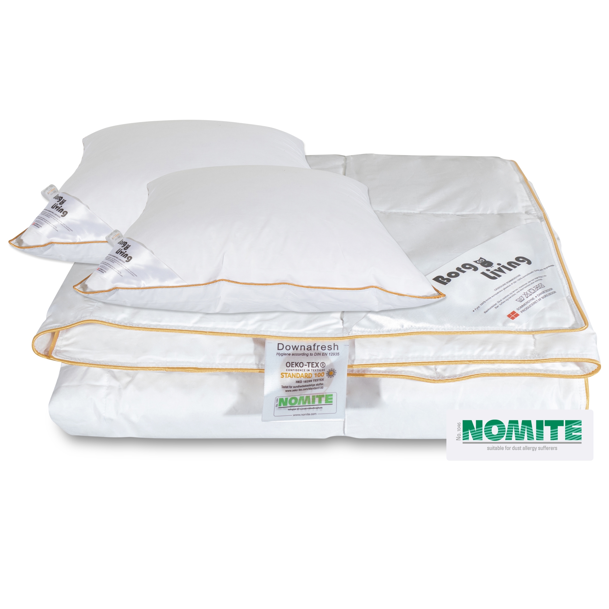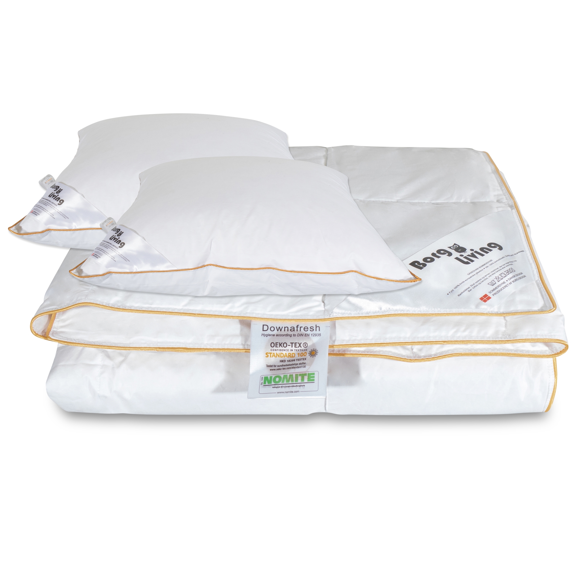 Framsidan »Täcken » Värmeklass » Sommartäcken Täcke och kudde - Dubbelt sommartäcke 200x200 cm + 2x60x63 kuddar med gåsdun - Borg Living Spara58% Borg Living 9.999,004.249,00SEKSpara 5.750,- Fri frakt på denna varaI lager Trustpilot Antal Lägg i varukorgen Se mer från: Borg Living Artikelnummer:BL244+2xBL554 Läs vår täckesguide Läs om underhåll av täcken och kuddar Se vårt stora utbud av kuddar Har du frågor om produkten? Täcke och kudde200x200 + 2x60x63 cm100 % gåsdun sommartäcke Täcke: Storlek: 200x200 cm Typ: Sommartäcke Fyllning: 100 % nya vita europeiska gåsdun Varumärke: Borg Living Fyllnadsvikt: 385 g Bärighet: Över 12 (gammal mätmetod) Bärighet: 800 (Ny mätmetod) Yttertyg: 100 % bomullssatin Konstruktion: 10x11 kassettäcke med guldkant Garanti: 5 år Kudde: Storlek: 60x63 cm x 2 st Typ: Medium kudde Konstruktion: 3-kammarkudde med gåsdun Varumärke: Borg Living Fyllnadsvikt: 800 g Ytterkammare: 2x75 g Fyllning i kärnan: 1x650 g - små fjädrar Bärighet: Över 10 (gammal mätmetod) 585 (Ny mätmetod) Yttertyg: 100 % bomullssatin (extra fin och mjuk) Garanti: 2 år Tvätt: 60° (Viktigt att använda enzymfritt tvättmedel) Torktumling: Måste torktumlas med torkbollar Certifiering: STANDARD 100 by OEKO-TEX® (BEHO-062282) / HKD 18299 TESTEX & (HKX 19275) Certifiering: NOMITE - Fri från husdammskvalster Certifiering: DOWNAFRESH - 100 % rena dun Certifiering: Downpass - Högsta djuretiska villkor Se alla våra kuddar här Detta täcke- och kuddset innehåller ett härligt dubbeltäcke med 100 % mjukt gåsdun av högsta kvalitet samt två medium kuddar. Det mjuka gåsdunet är känt för sin höga isoleringsförmåga och fina kvalitet. Täcket är ett sommartäcke med 385 g gåsdun och en Bärighet på över 12. Sommartäcket är konstruerat med kassetter som jämnt fördelar fyllningen och därigenom säkerställer optimal isolering och temperatur över hela täckets yta. Yttertyget är sytt av 100% bomullssatin i en tät väv, vilket säkerställer att täcket är duntätt och ger hög absorption. Ett riktigt läckert dubbeltäcke och kuddset för den varma sommaren + 2 kuddar. Täcke: Svalt och luftigt sommartäcke med europeiskt gåsdun – perfekt för de varma sommarnätterna. Blir du varm när du sover? Då kan vi rekommendera det här sommartäcket från Borg Living. Täcket är fyllt med mjukt, vitt gåsdun. Det mjuka och lätta dunet gör att täcket faller lätt runt kroppen. Täcket är sytt i kassetter, vilket gör att dunet fördelas jämnt. Sommartäcket har ett härligt mjukt yttertyg i 100 % bomullscambric som är så tätvävt att dammkvalster inte kan tränga igenom. Se vårt stora utbud av dubbelt påslakanset i storleken 200x200 cm här Kudde: Kudden är konstruerad i tre kammare för att säkerställa bästa möjliga stöd och komfort. Den inre kammaren ger stöd och höjd åt kudden, medan de yttre kamrarna ger en mjuk och bekväm känsla. Denna serie finns i 3 höjder, så att du kan hitta den kudde som passar dig bäst. Detta är kudden med 'medelhöjd' i serien. Denna höjd passar bra om du vilar skönt på sidan men också ofta vaknar på rygg. Mellanhög gåsdunkudde ger dig en skön mjuk kudde och bra stöd för nacke, huvud och kropp under din sömn. Det danska varumärket Borg Living producerar exklusiva serier av täcken, kuddar och hemtextilier för ditt hem. Varumärket som grundades 2013 är känt för sin nytänkande inom kvalitet och design. Borg Livings fantastiska produkter bidrar till en optimal och behaglig nattsömn samt dekorerar ditt hem med moderna och snygga heminredningsdetaljer. Tillbaka till Sommartäcken Du kanske också är intresserad av: Varmt täcke 140x200 cm - myskduntäcke från Borg Living med 100% dunMyskduntäcke - Borg Living Bärighet: Över 12 100 % myskdun 5.299,00 SEK2.185,00 SEK