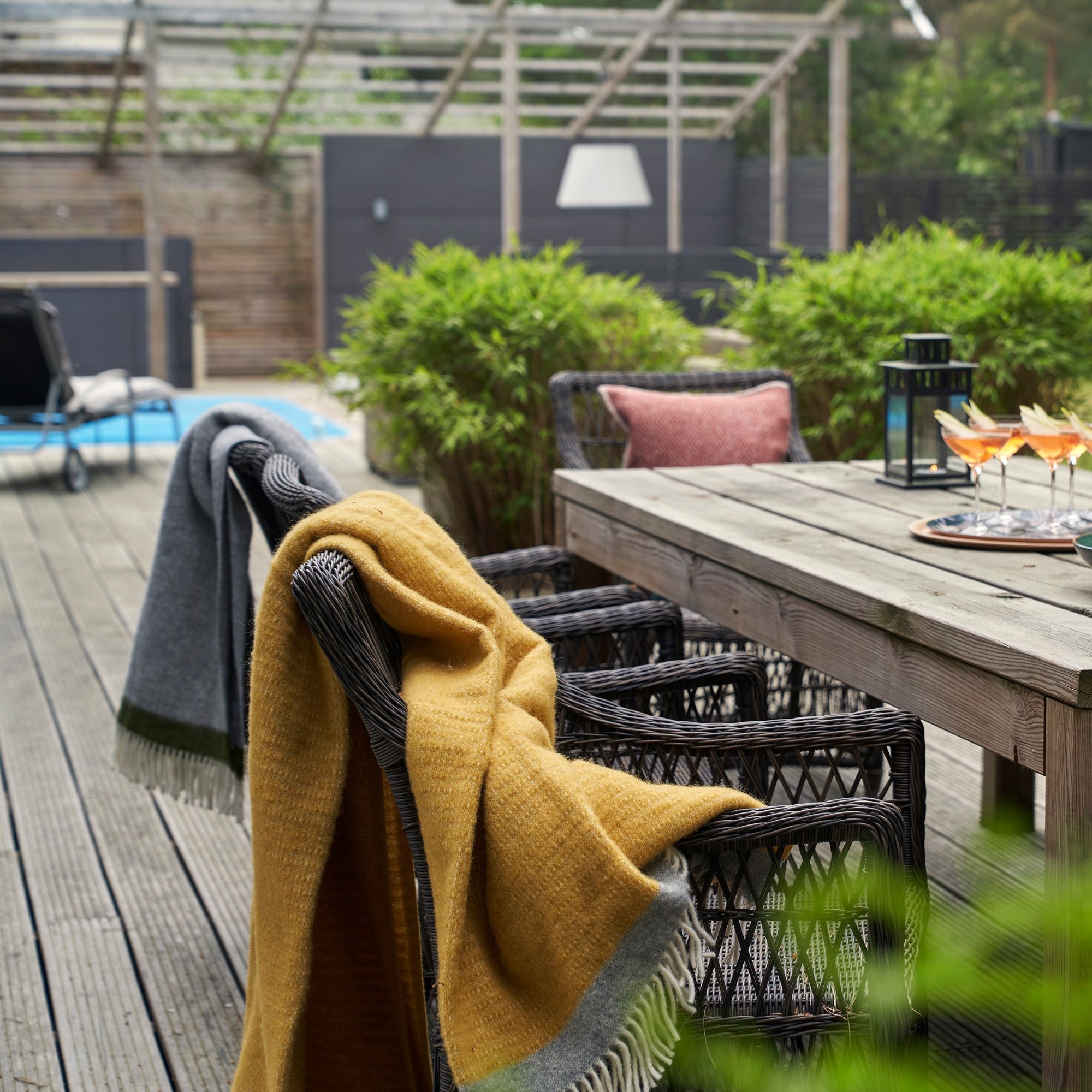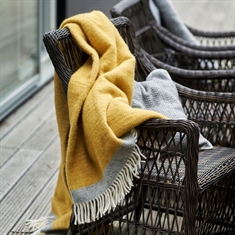 Det eleganta och tidlösa mönstret i kombination med den vackra gula färgen skapar ett lugnt och harmoniskt uttryck som passar perfekt i modern skandinavisk inredning. Pläden fungerar både som en praktisk filt och som ett dekorativt inslag som tillför värme och mys i hemmet.