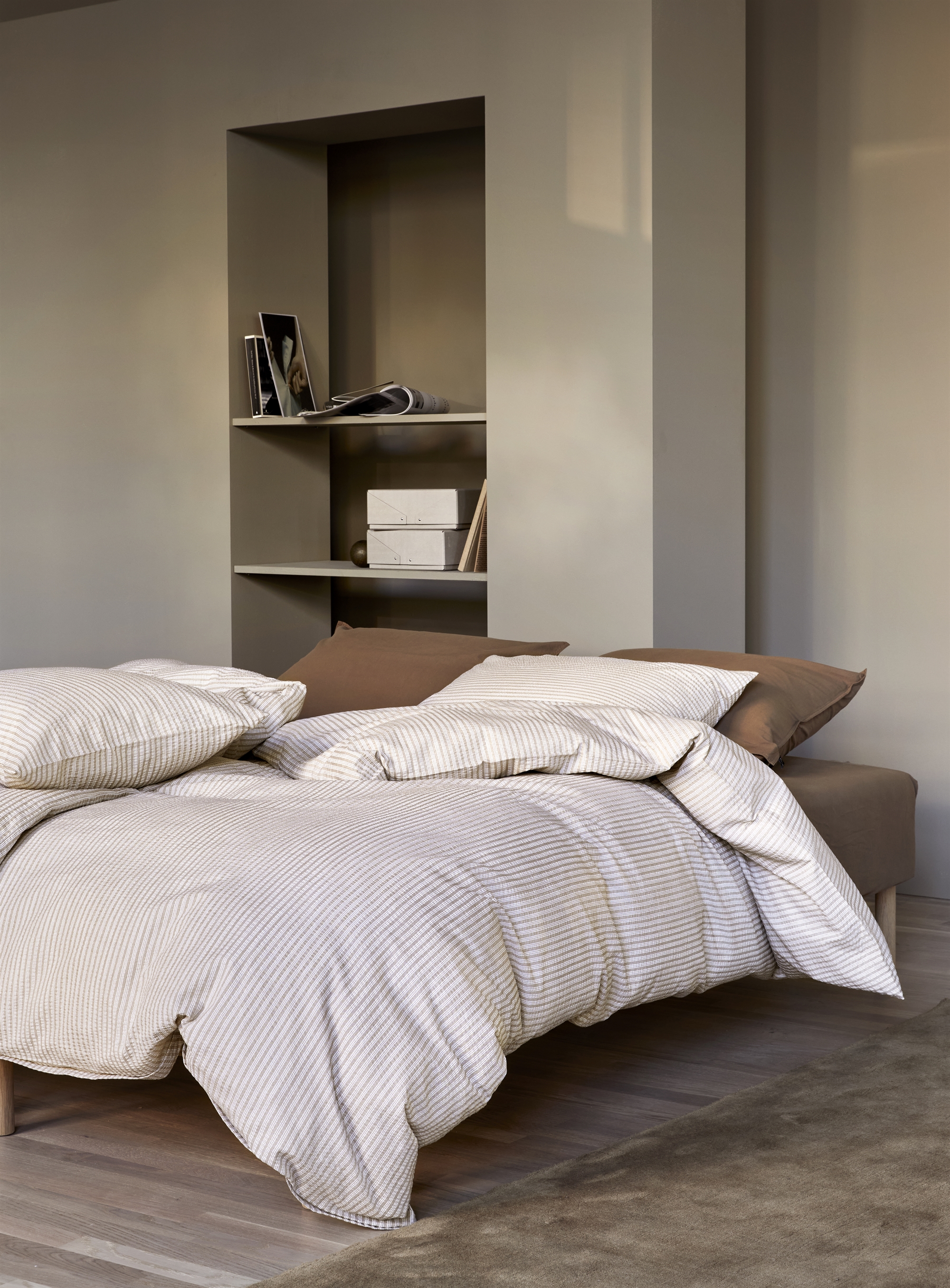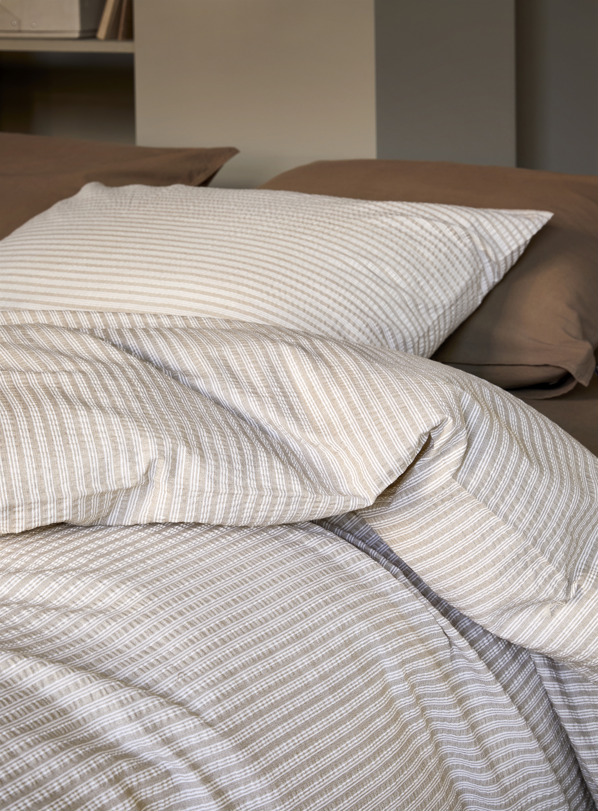 Framsidan »Sängkläder » Enkelt påslakanset » Extra långa sängkläder 140x220 cm Vävt krepp sänglinne 140x220 cm - 100% mjuk bomull - Brun med ränder - Kreppsängkläder - Slumre Høie Of Scandinavia Spara27% Høie Of Scandinavia 1.099,00799,00SEKSpara 300,- Fåtal i lager Trustpilot Antal Lägg i varukorgen Se mer från: Høie Of Scandinavia Artikelnummer:8351-2 Läs vår sängklädessguide Se vårt stora utbud av lakan Se vårt stora utbud av täcken 140x220 Har du frågor om produkten? OEKO-TEX® certifieradMjukt, lätt och luftigtExklusivt luftigt vävt krepp Påslakan: 140x220 cm Örngott: 1 st. á 60x63 cm Material: 100% mjuk bomull - Vävt krepp Vävning: 200TC Kreppsängkläder (Thread count = antal trådar per kvadrattum) Färg: Brun med ränder Design: Slumre karamellbrun Brand: Høie of Scandinavia Stängning: Påslakan med dragkedja, örngott med omlott Tvätt: 60° Torktumlare: Ja Strykning: Nej Certifiering: STANDARD 100 by OEKO-TEX® (19.HIN.85821). Din garanti för att produkten är fri från hälsoskadlig kemi. De extra fina bomullstrådarna skapar en delikat kreppvävning. Perfekt för dig som älskar den mjuka och knastriga känslan. I vävt bomullskrepp i 100% bomull skapas de unika luftfickorna i vävningen. Kreppvävningen är varm på vintern och sval på sommaren, och ger en mjuk och spröd känsla av krepp efter tvätt efter tvätt. En klassiker som inte behöver strykning. Detta randiga Slumre sänglinne är producerat av 100% mjuk bomull med vävningsmetoden Kreppsängkläder, också kallad bomullskrepp. Denna vävning ger skrynkeleffekten och skapar luftfickor i materialet, vilket gör att sänglinnet känns ljust, luftigt och ofta svalare än andra materialtyper. På sommaren upplevs sänglinnet luftigt, och på vintern känner du värmen från den mjuka bomullen, vilket är en unik fördel som denna fina kombination av material och vävning ger. Påslakanet bör inte strykas, då det har sina luftfickor i själva vävningen. Sänglinne med denna vävtyp passar särskilt bra för dig som ibland upplever att du har det varmt på natten, då sänglinnet kan tillföra ökad andningsförmåga och hög absorberingsförmåga. Köp enkelt örngott till dina extra kuddar här Fräscha upp sängen och sovrummet med ett snyggt och läckert set sängkläder som detta. Passa samtidigt på att säkerställa maximal sovkomfort genom att lägga till ett nytt mjukt lakan av hög kvalitet. Du hittar vårt stora sortiment av kvalitetslakan här Høie är ett skandinaviskt varumärke som står för tradition förenat med nytänkande. Företaget har funnits sedan 1850 och har under åren varit med och format och utvecklat skandinavisk textil och design. Sänglinnen från Høie är vardagslyx som alla förtjänar. Tillbaka till Extra långa sängkläder 140x220 cm