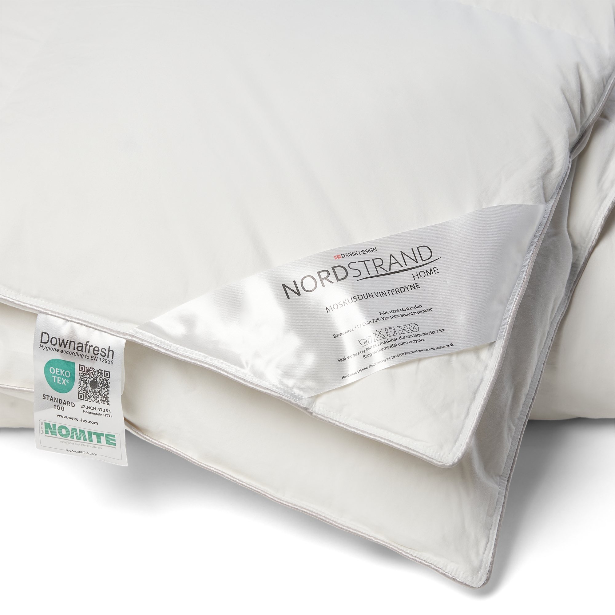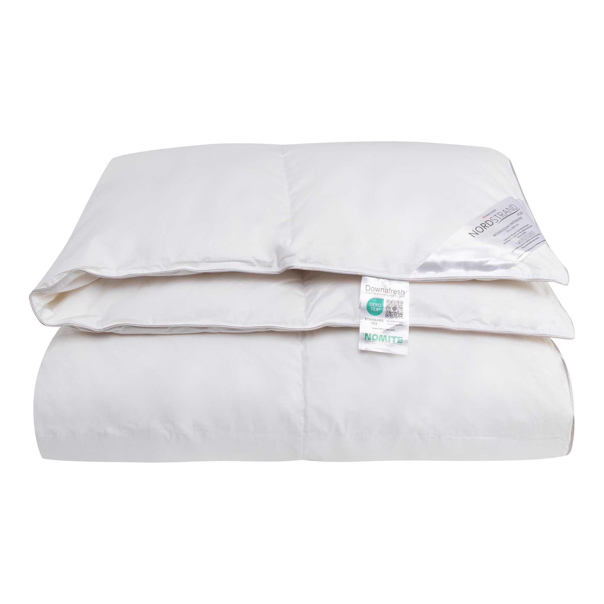 Det mjuka överdraget av 100% bomullscambric är dun-tätt och fint vävt i kassetter så att dammkvalster inte kan tränga igenom och dunen har bästa förutsättningar för god isolering och jämn värmefördelning. Denna täta vävning gör också att täcket är NOMITE-certifierat, eftersom dammkvalster inte kan tränga igenom överdraget, vilket också gör täcket lämpligt för allergiker.